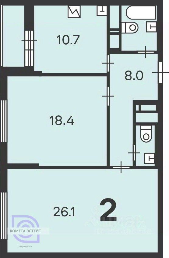 Продается 2-к. квартира в новом монолитном доме. В планировке — две изолированные большие комнаты, 26 кв.м и 18 кв.м., кухня 10 кв. м. с застекленной лоджией 3 кв. м. и два санузла (один с ванной)