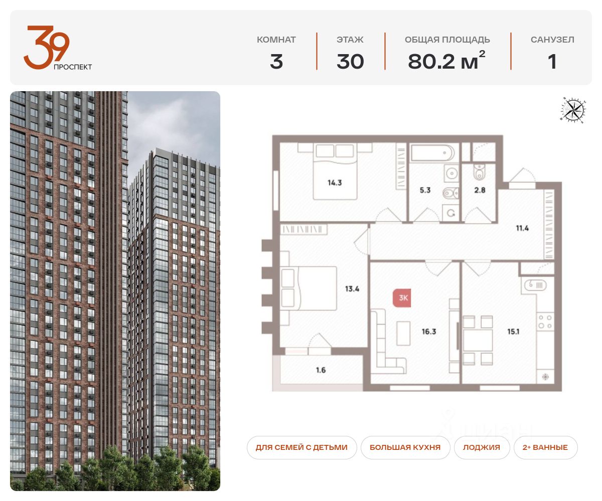 Продается трехкомнатная квартира в ЖК ''Проспект 39'' по адресу Москва, ЮВАО, Рязанский проспект, вл. 39, к. 2. Общая площадь квартиры - 80,20 кв.м., этаж 30. Стоимость квартиры - 30 655 743 р. Продаётся без отделки.