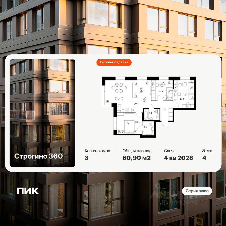 Новостройка! Продается 3-комн. кв-ра площадью 80,9 кв.м, (Корпус 1.1.3, Секция 3) 4 этаж 30-этажного дома в Строгино 360 от ПИК. Проект, где каждый день будет наполнен гармонией и новыми возможностями, где можно найти идеальный баланс между энергией большого города и спокойствием природного окружения. Это настоящая экосистема в окружении четырех парков и набережной Москвы-реки, где современная архитектура, умные технологии и продуманная среда создают новое качество жизни. Здесь дом — не точка на карте, а пространство состояния: покоя, сосредоточенности, внутренней свободы.Ты всё ещё в городе. Но ты уже в стороне от его суеты.