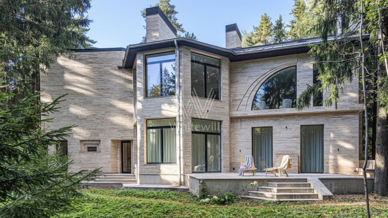 Лебединое озеро. Загородный особняк площадью 720 м² расположен на ухоженном лесном участке 20 соток. Архитектура в духе неоконструктивизма с характерными силуэтами, вдохновлёнными зданием Сиднейского оперного театра, выглядит эффектно и современно. Безрамные панорамные окна TREND открывают вид на лес, а фасад из натурального травертина подчёркивает природный характер дома.
