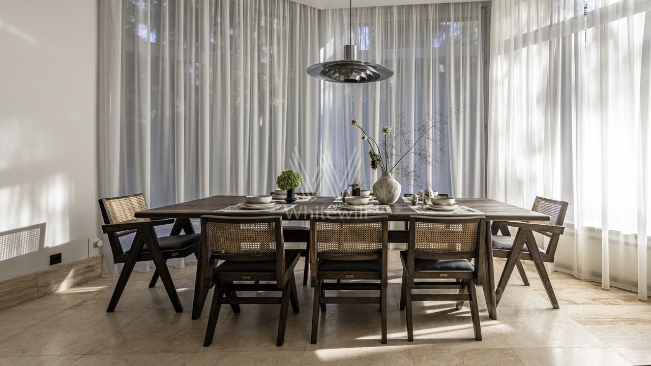 Планировка объединяет открытость и функциональность. Кухня-гостиная площадью 107,5 м² включает каминную зону и эркерную столовую, где приятно завтракать с видом на сосны или проводить вечерние ужины с близкими. Уровнями выше предусмотрены кабинет, лаунж-зона, эксплуатируемая кровля и шесть спален, среди которых 4 спальни для хозяев дома и две — для обслуживающего персонала.