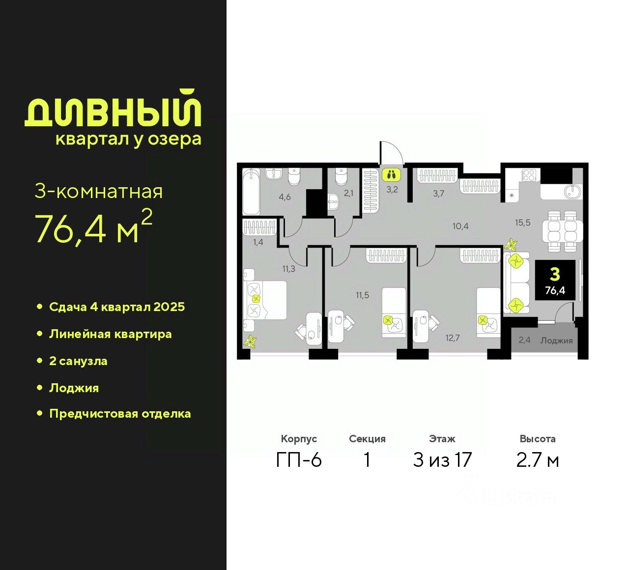 Просторная 3-комн. квартира с предчистовой отделкой в ЖК ''Дивный квартал у озера'' на 3 этаже. Общая площадь: 76.4 кв.м., жилая: 35.5 кв.м., площадь просторной кухни-столовой: 15.5 кв.м. Комнаты изолированные, все окна выходят на одну сторону. В квартире одна лоджия, один совмещенный и один раздельный санузел. Высота потолков 2.7 м.