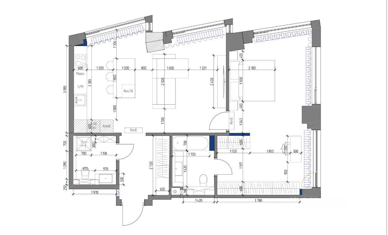 Планировка: кухня-гостиная + спальня (мастер-блок) с гардеробной и рабочей зоной.