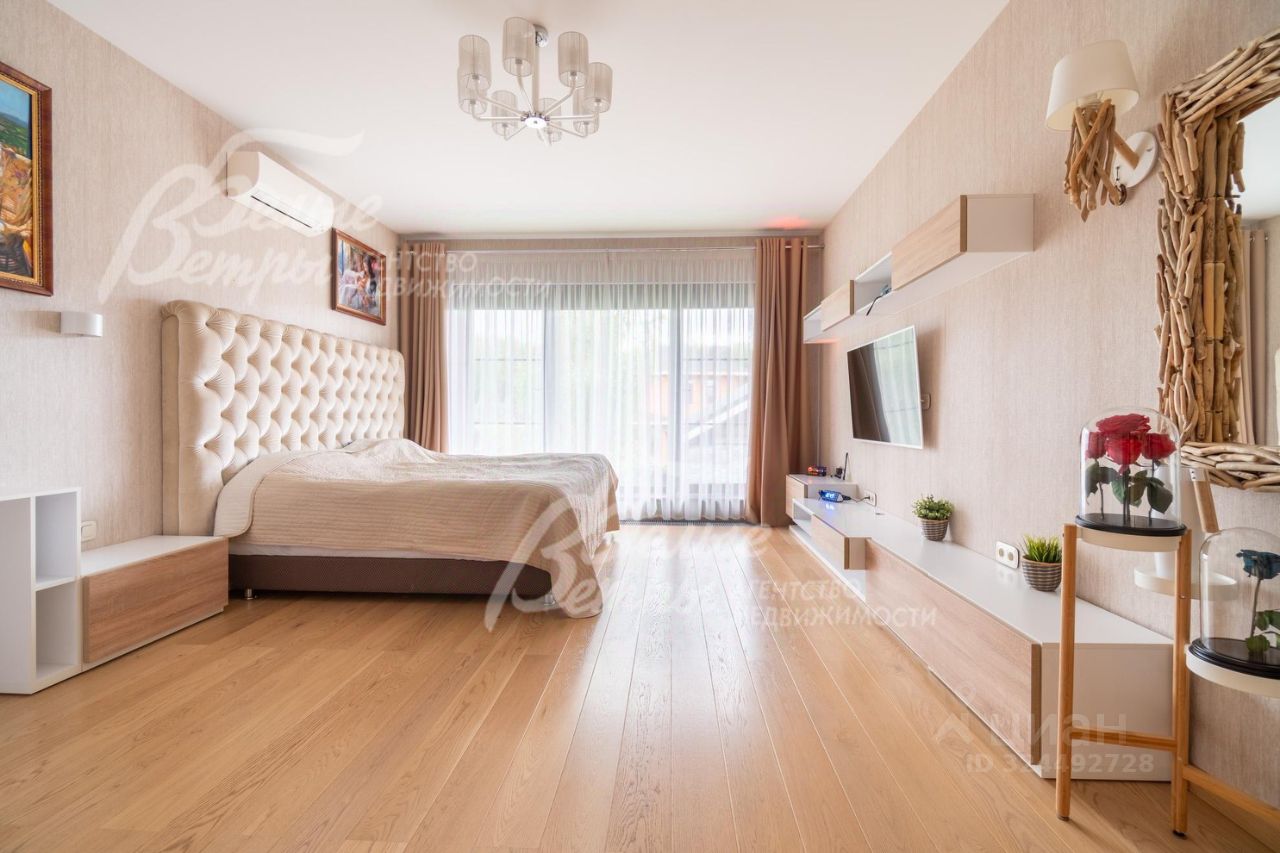 Мебель, оборудование: все комнаты и помещения меблированы. На кухне: немецкий встроенный гарнитур (фасады - имитация палисандра) со всей необходимой встроенной техникой марки Neff. В гостиной: большой комфортный кожаный диван и кресла-реклайнерами (с механизмом откидывания спинки и подножки), стильный столовый гарнитур. В спальнях: спальные гарнитуры импортных производителей. Везде установлены телевизоры. Интерьер украшают шторы с тюлем и римские шторы. Интерьер украшают живописные полотна (копии мировых шедевров, созданные московскими художниками-копиистами). На террасе и в бане - уличная мебель. Санузлы укомплектованы сантехникой Tece.