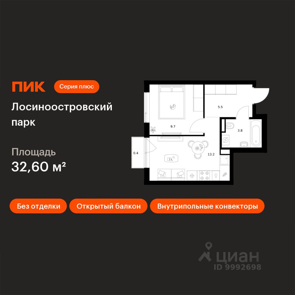 Продаётся 1-комн. квартира площадью 32,6 кв.м на 4 этаже 17 этажного дома (Корпус 2.3, Секция 2) проекта ПИК Лосиноостровский парк. Светлый просторный подъезд на уровне земли, функциональная планировка, большие окна, без отделки.