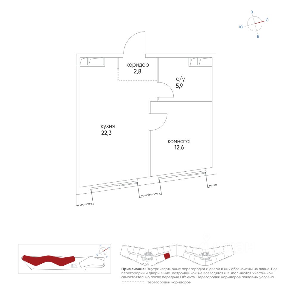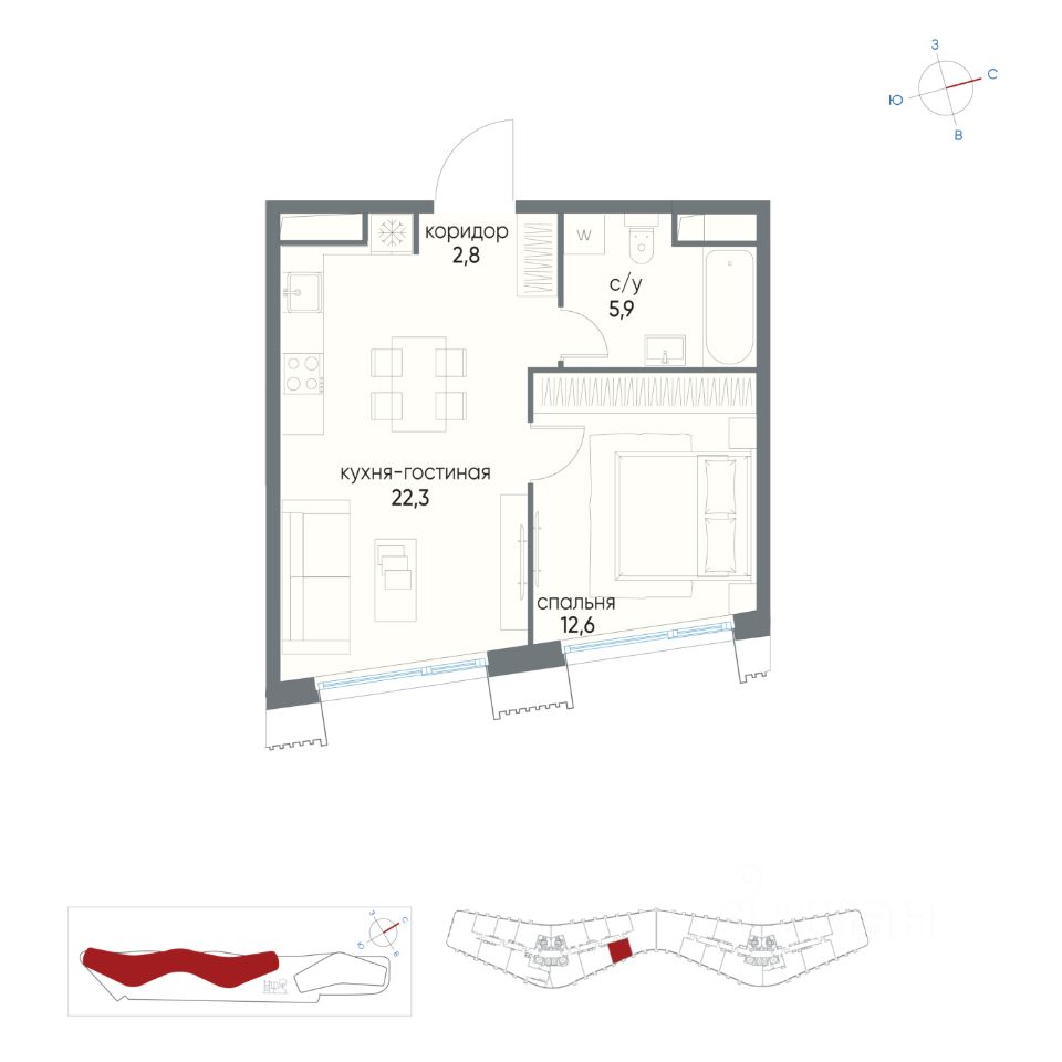 Квартира c функциональной планировкой, общей площадью 43.6 кв.м: Спальня - 12.60 кв. м Кухня-гостинная - 22.30 кв. м