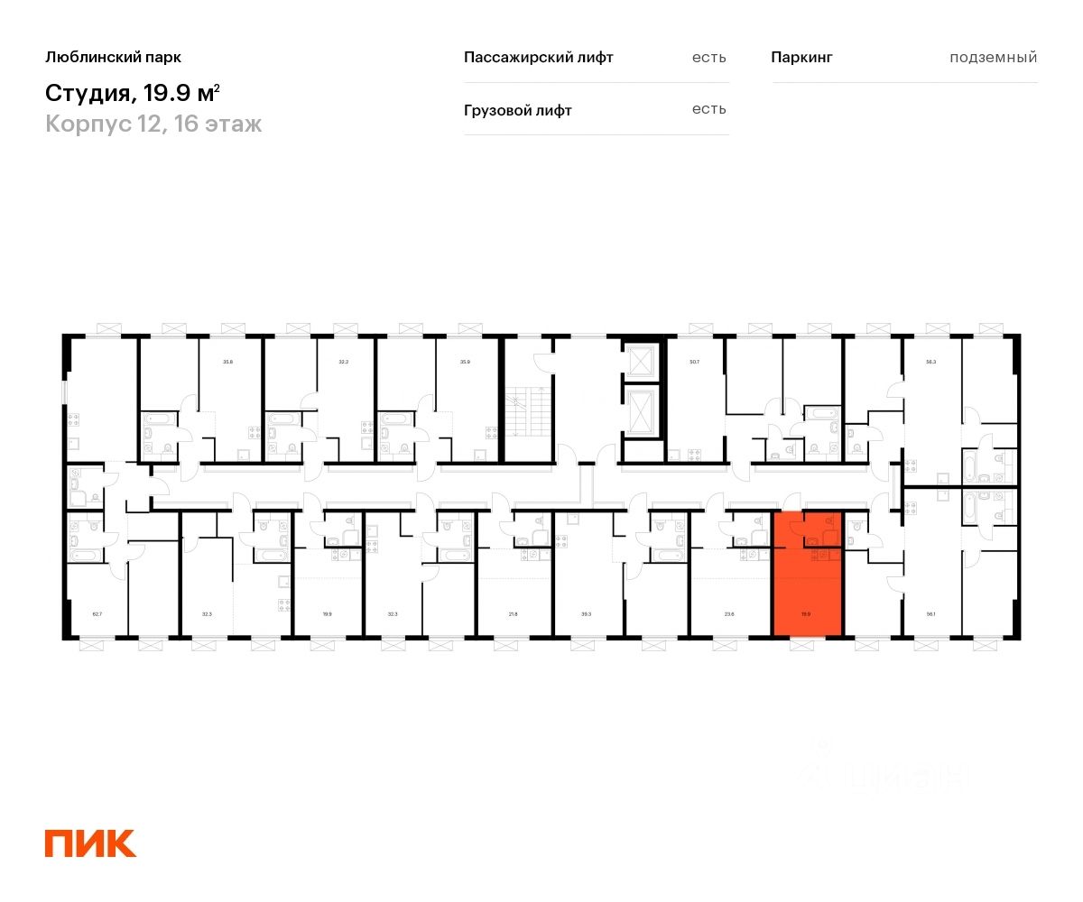 Продаётся квартира-студия площадью 19,9 кв.м на 16 этаже 16 этажного дома (Корпус 12, Секция 7) проекта ПИК Люблинский парк. Светлый просторный подъезд на уровне земли, функциональная планировка, большие окна, c отделкой.