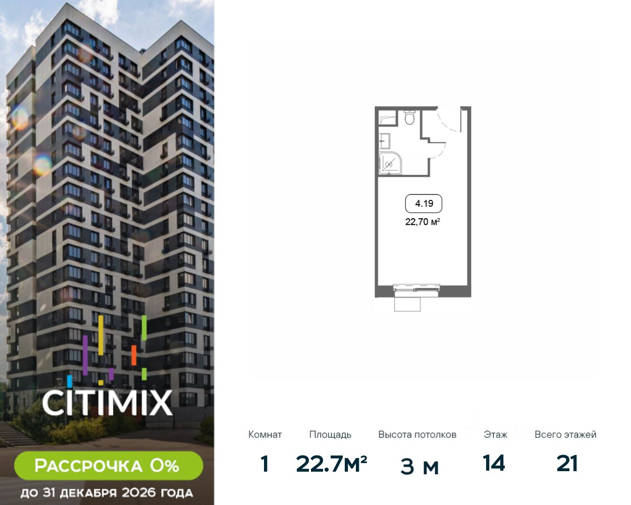 Продаётся студия в корпусе 4, общей площадью 22.7 м², на 14 этаже. Строительство корпуса завершено. Срок ввода — июль 2026 года.