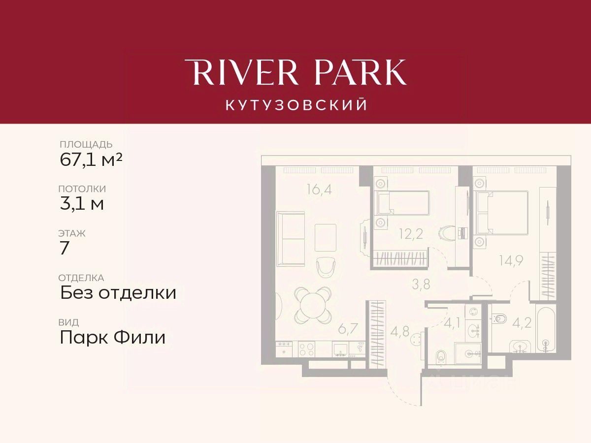 Продается 2-к квартира площадью 67.1 кв.м. на 7-м этаже в жилом комплексе премиум-класса River Park Кутузовский в Башне Lazur Tower