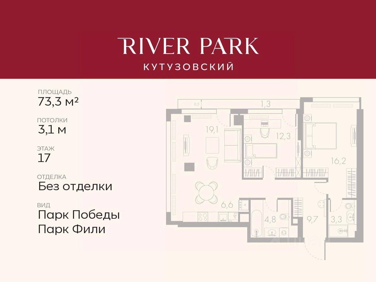Расположение и Транспортная доступность: - На берегу Москвы-реки, напротив Москва-Сити - 600 метров до Кутузовского проспекта - Удобный съезд с ТТК - Прямой выезд на МКАД по Северному дублеру Кутузовского проспекта. - В пешей доступности 3 станции метро: Фили, Парк Победы, Кутузовская, а также станция МЦД Фили. Архитектура от именитого бюро ADM отличается уникальной пластикой фасадов - башни словно парят в воздухе, играя гранями как драгоценные камни. Жилой комплекс состоит из 5-ти небоскребов с home park на закрытой территории и внешней торговой галереей с открытым доступом.