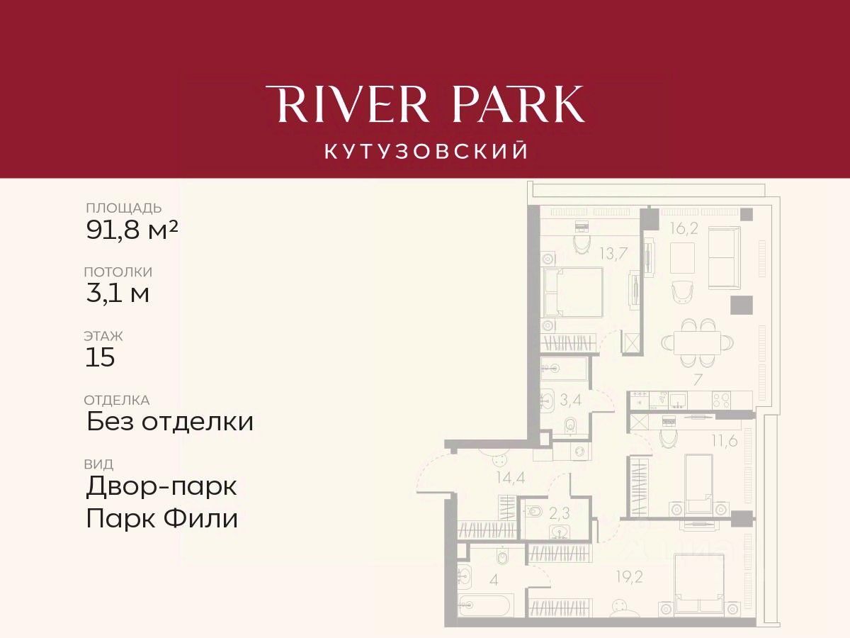 Расположение и Транспортная доступность: - На берегу Москвы-реки, напротив Москва-Сити - 600 метров до Кутузовского проспекта - Удобный съезд с ТТК - Прямой выезд на МКАД по Северному дублеру Кутузовского проспекта. - В пешей доступности 3 станции метро: Фили, Парк Победы, Кутузовская, а также станция МЦД Фили. Архитектура от именитого бюро ADM отличается уникальной пластикой фасадов - башни словно парят в воздухе, играя гранями как драгоценные камни. Жилой комплекс состоит из 5-ти небоскребов с home park на закрытой территории и внешней торговой галереей с открытым доступом.