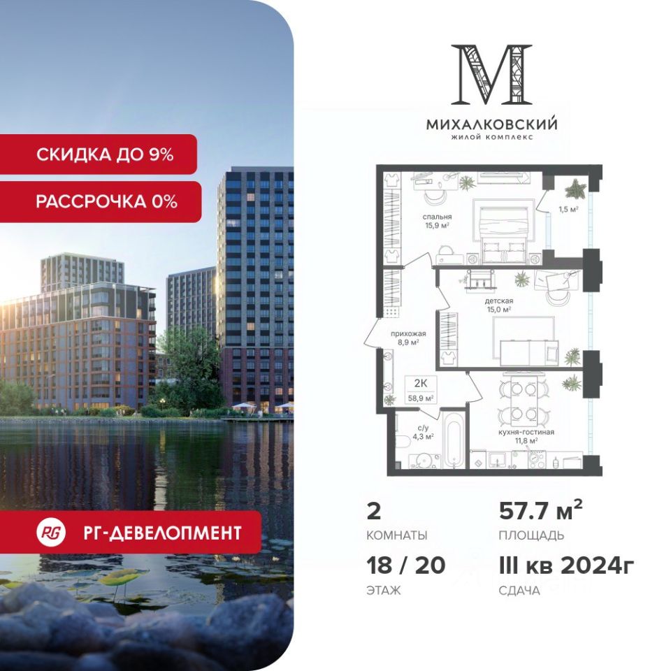 Продаётся 2-к квартира 57,7 кв.м. в ЖК ''Михалковский'' на 18-м этаже 20 этажного дома.