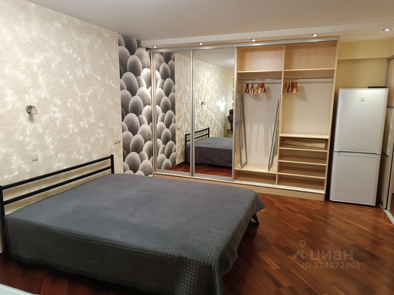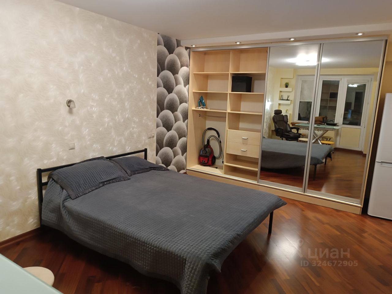 Новая кровать с новым ортопедическим матрасом, новые подушки и одеяло, вместительный шкаф-купе с зеркальными фасадами, душевая кабинка, кондиционер, стиральная машинка, полноценная плита с духовым шкафом, двухкамерный холодильник, большой телевизор.