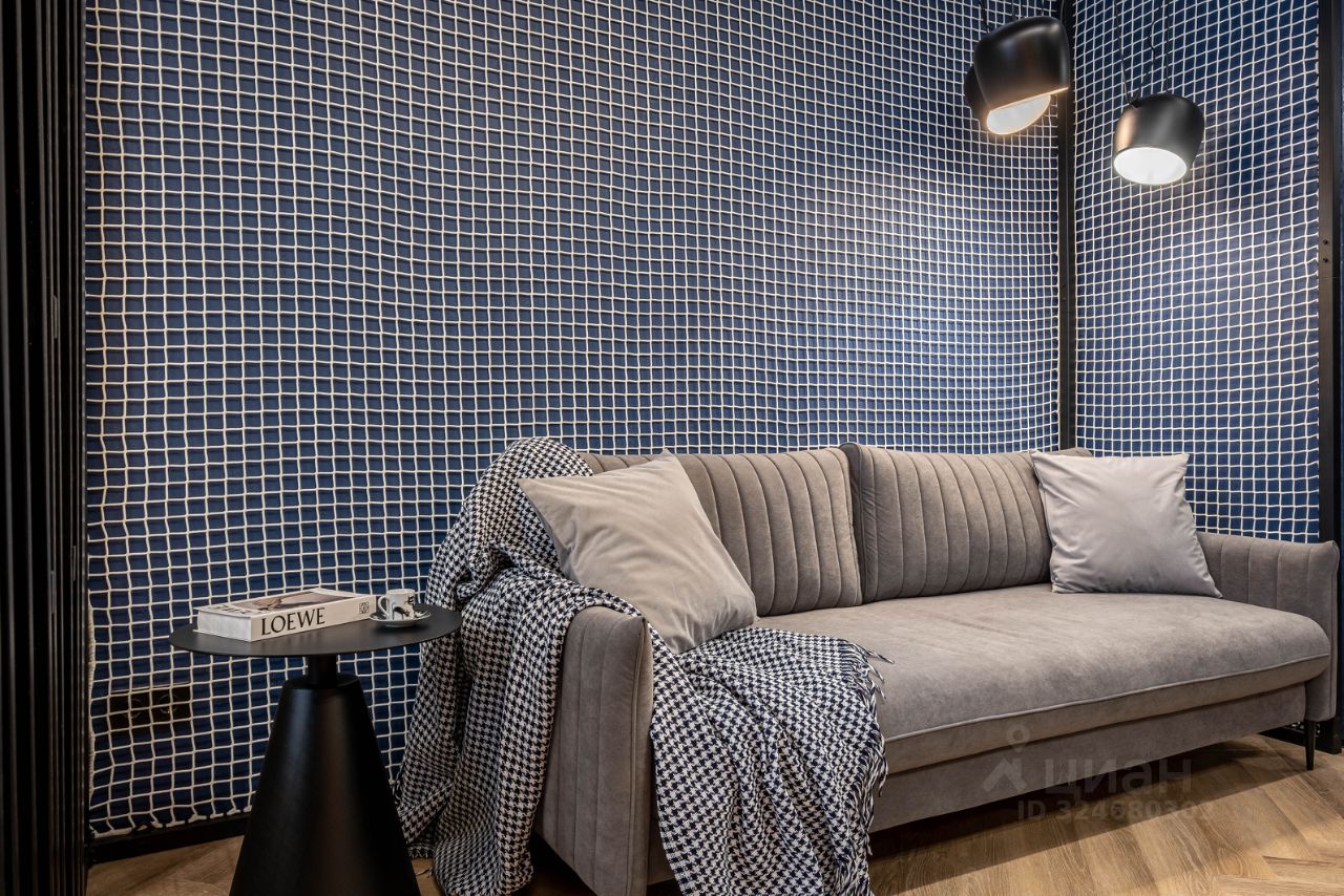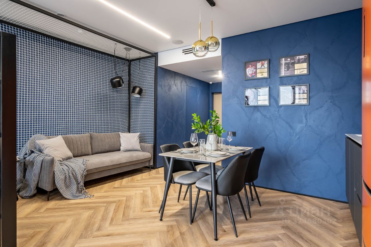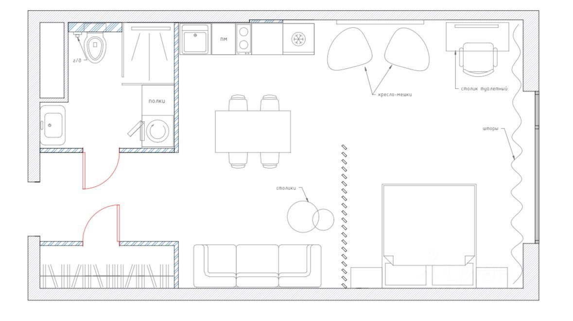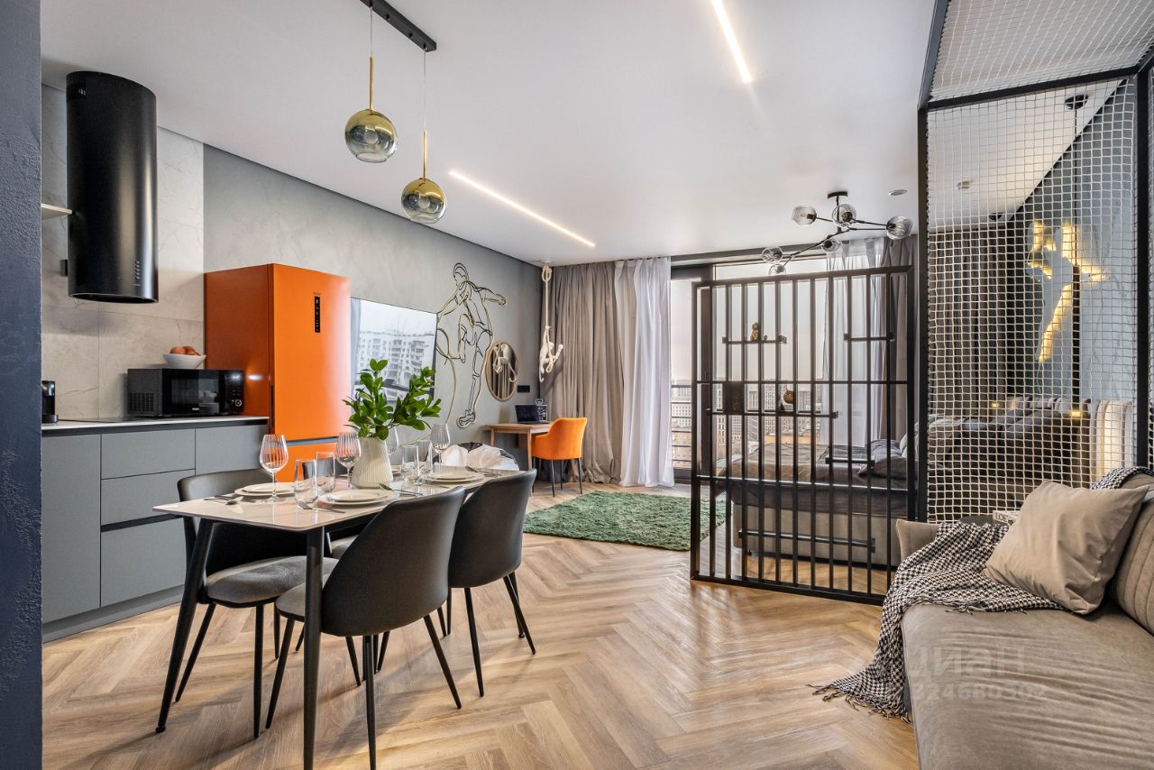 • Гостиная: Зона гостиной объединена с кухней, оборудована разборным диваном и телевизором с функцией Smart-TV.