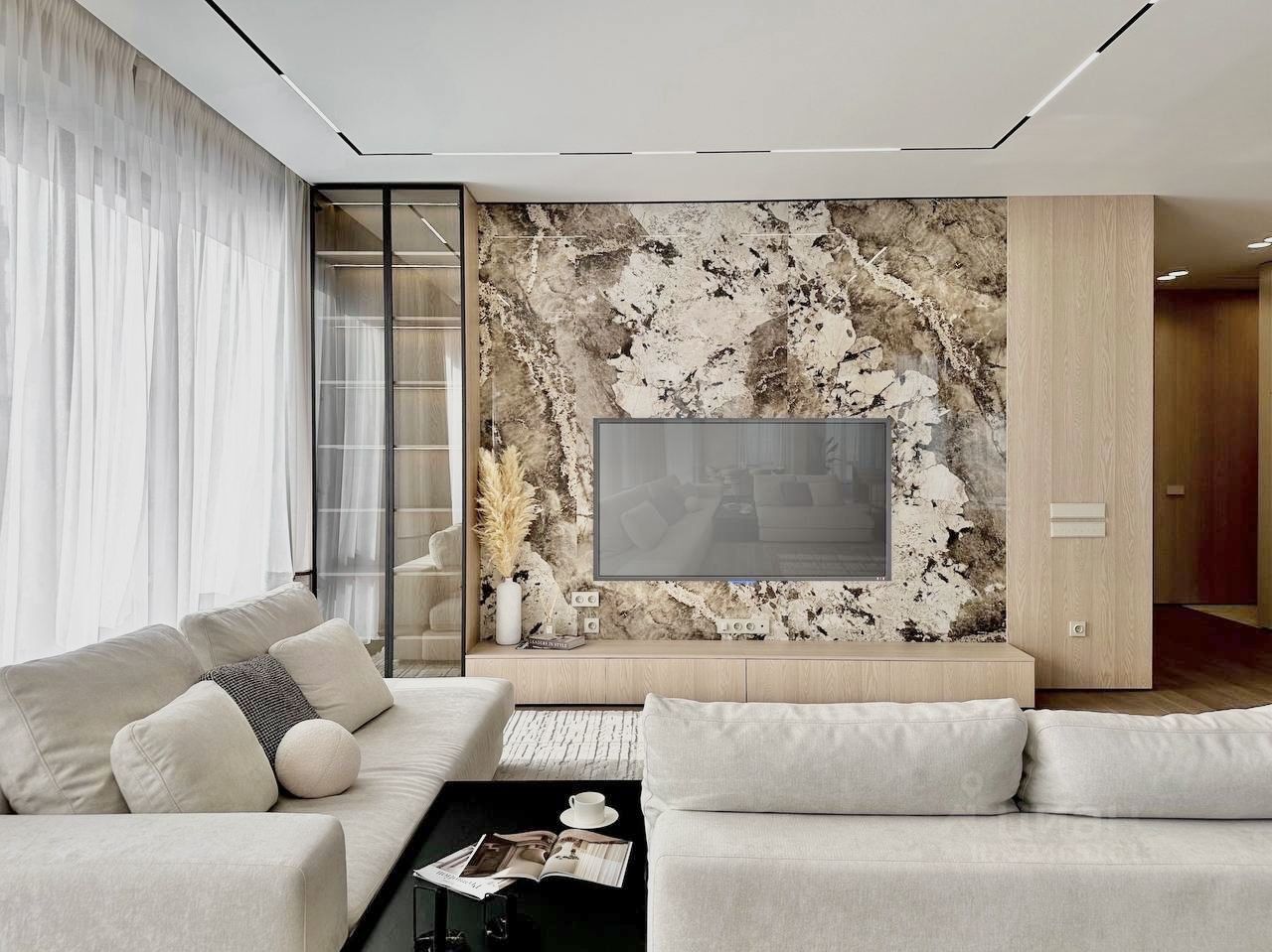 Квартира с тремя изолированными спальнями. Очень светлая, 7 окон на 2 стороны света, вид на центр Москвы и Останкинскую башню. Огромная гостиная 50м2. Две большие гардеробные комнаты, 3 санузла. Квартира укомплектована дорогой мебелью и техникой.