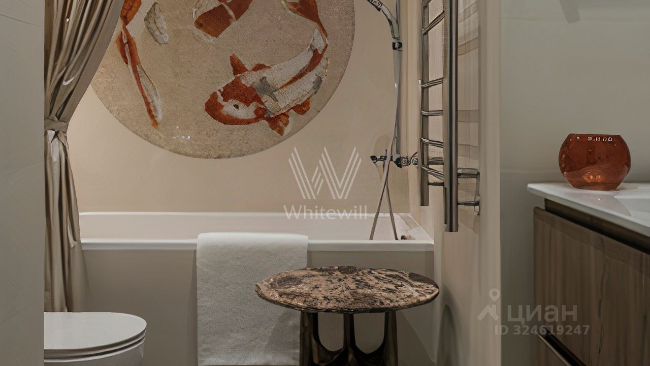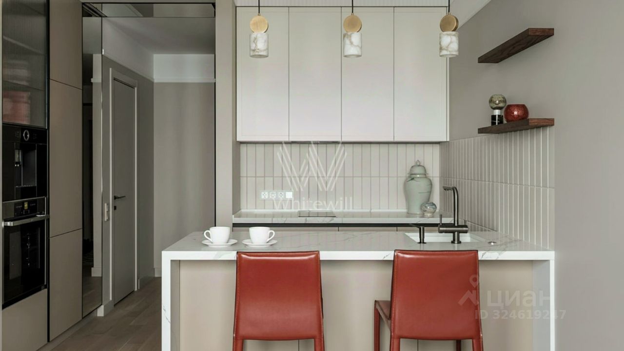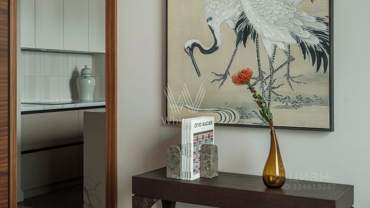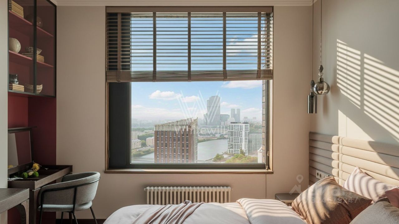 Уютная квартира с 1-й спальней в комплексе бизнес-класса ''Береговой'' на берегу Москвы-реки. Квартира общей площадью 46 м² расположена на 26-м этаже. Выполнен дизайнерский ремонт в стиле ''джапанди'' в лаконичных светлых тонах. В отделке использованы натуральные материалы — керамогранит, дуб, орех, кварц, мрамор, натуральный камень. Интерьер дополняют элементы мозаики и живопись. Панорамные окна наполняют пространство светом и открывают вид на реку и башни делового центра ''Москва-Сити''.
