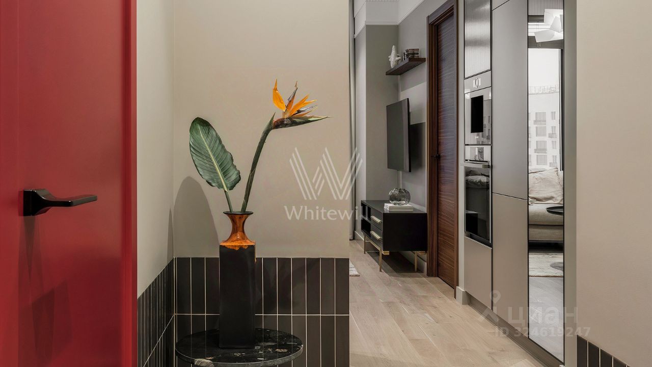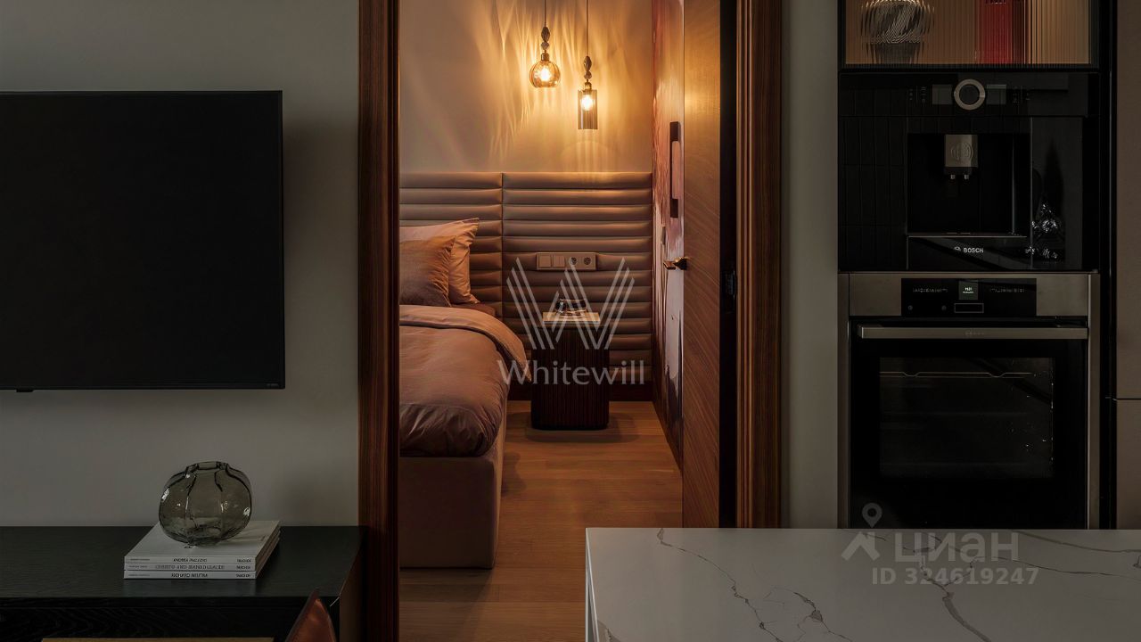Спланирована кухня-гостиная, спальня с полноразмерной кроватью и ортопедическим матрасом, ванная комната, 2 гардеробные, постирочная, холл. Квартира полностью меблирована и укомплектована бытовой техникой Bosch и Neff, включая кофемашину, духовой шкаф, варочную панель, посудомоечную машину, микроволновую печь, а также встроенный холодильник Liebherr. В раковине установлен измельчитель, кран со встроенным фильтром для воды, в столешницу убран накопитель для моющих средств. Постирочная оборудована стиральной и сушильной машинами Bosch. Квартира оснащена центральным кондиционированием.