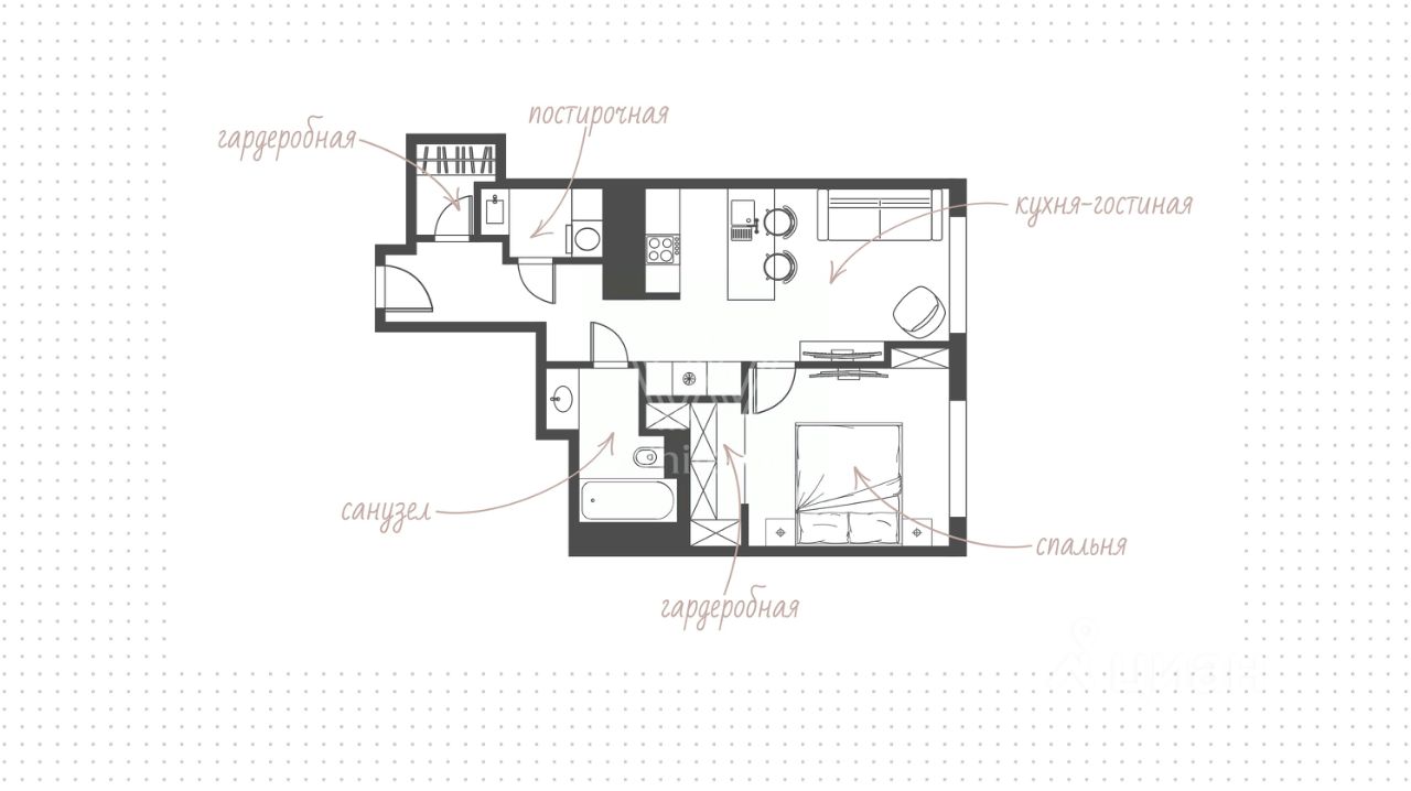 Спланирована кухня-гостиная, спальня с полноразмерной кроватью и ортопедическим матрасом, ванная комната, 2 гардеробные, постирочная, холл.