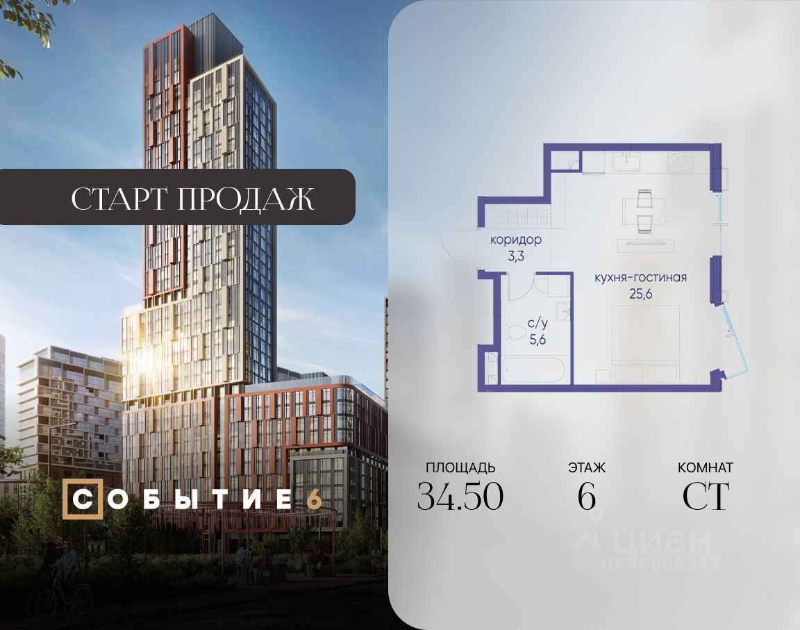 Продаётся квартира-студия от застройщика: общая площадь 34.50 м², жилая 20.00 м², кухня 5.60 м², 6-й этаж, жилой квартал ''Событие-6'', корпус 2 (секция 2) Срок сдачи: 1 квартал 2029 года.