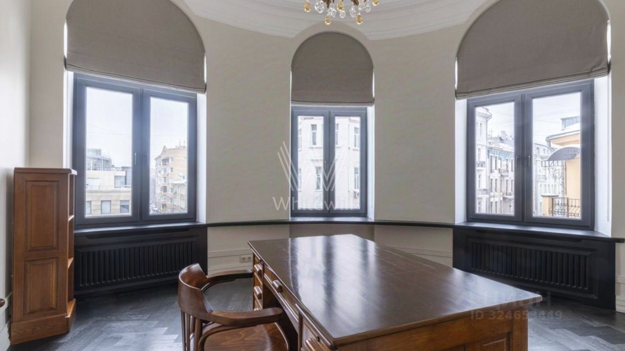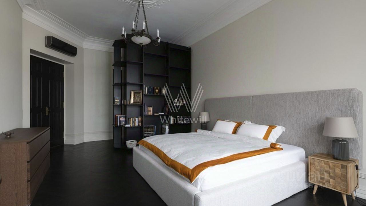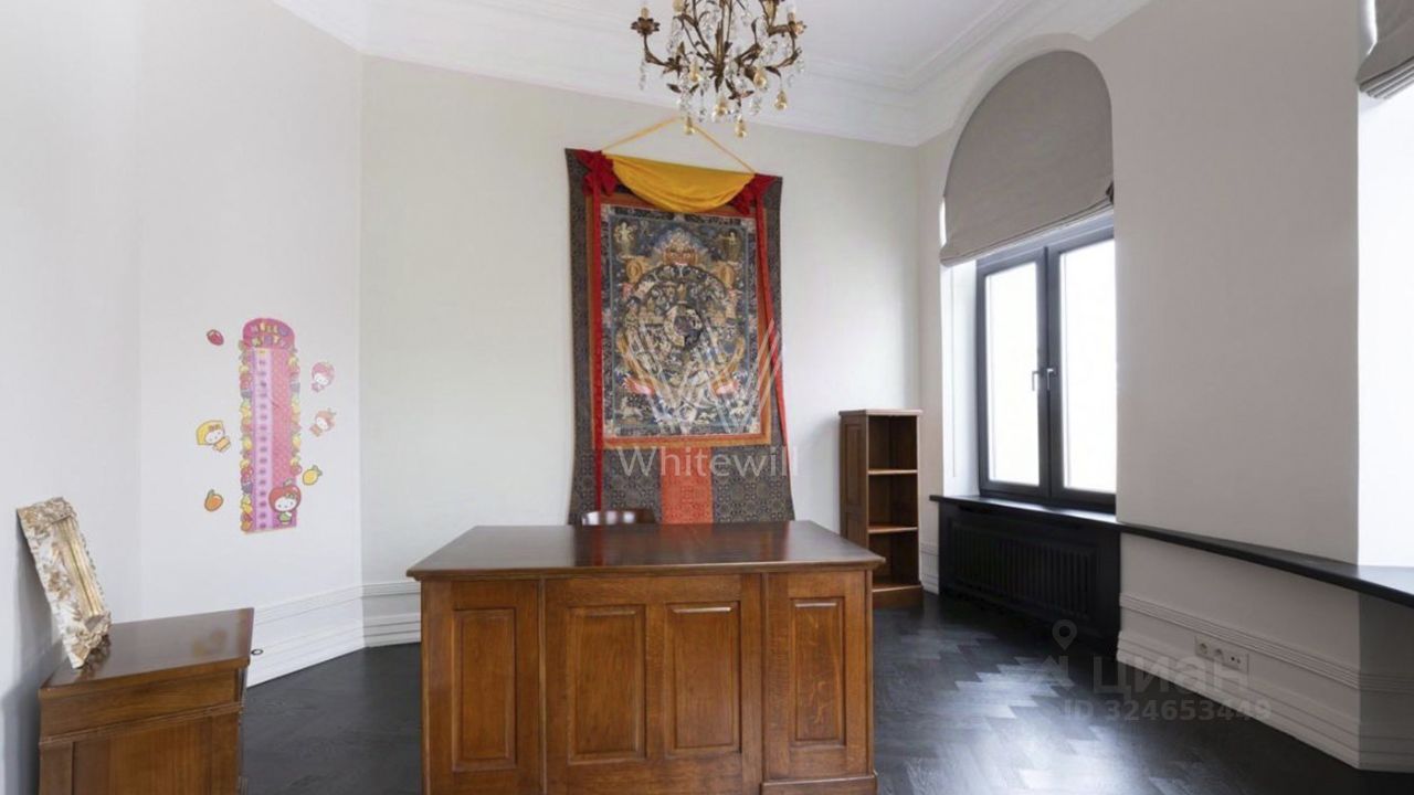 Планировка: гостиная со столовой зоной и настоящим камином, просторная кухня, мастер-спальня со своей гардеробной и ванной комнатой, вторая спальня с гардеробом, кабинет или дополнительная спальня, гостевой санузел с постирочной. Из гостиной и кабинета с эркерами открывается вид на Патриарший пруд.