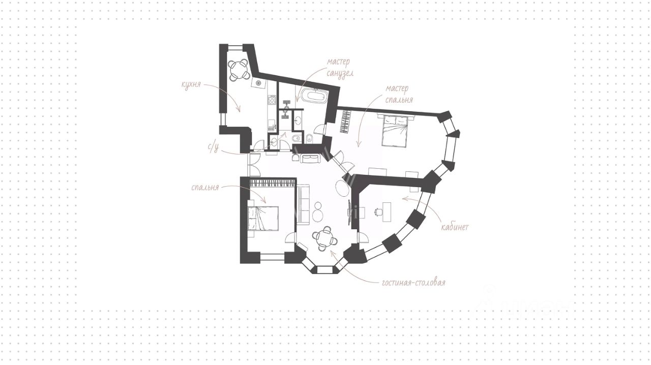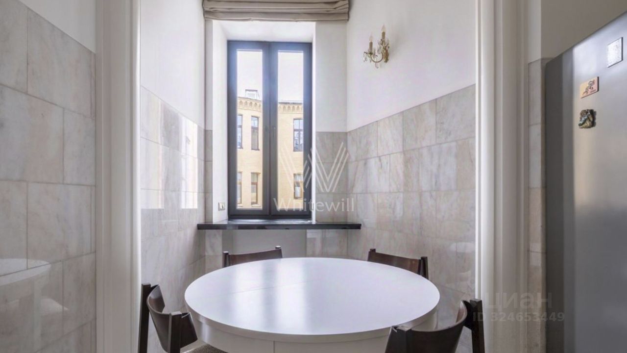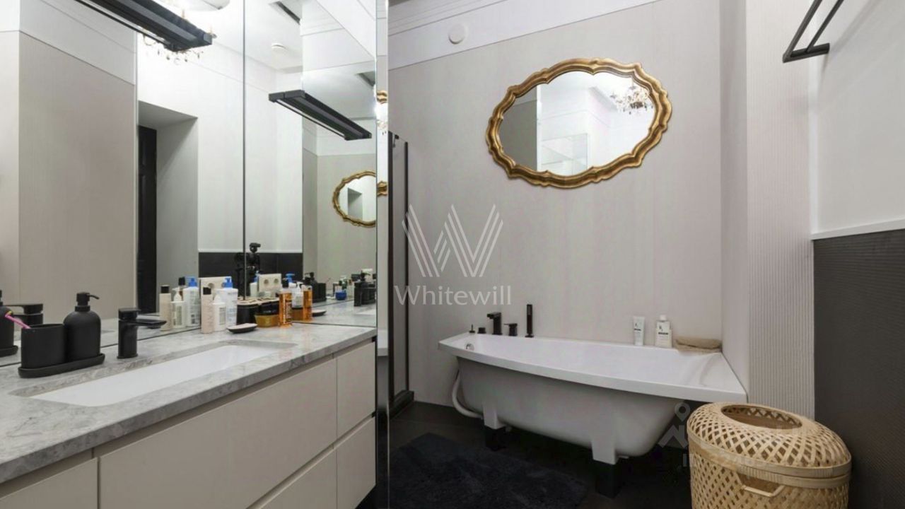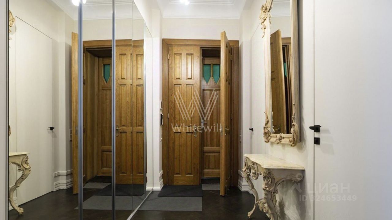 Планировка: гостиная со столовой зоной и настоящим камином, просторная кухня, мастер-спальня со своей гардеробной и ванной комнатой, вторая спальня с гардеробом, кабинет или дополнительная спальня, гостевой санузел с постирочной. Из гостиной и кабинета с эркерами открывается вид на Патриарший пруд.