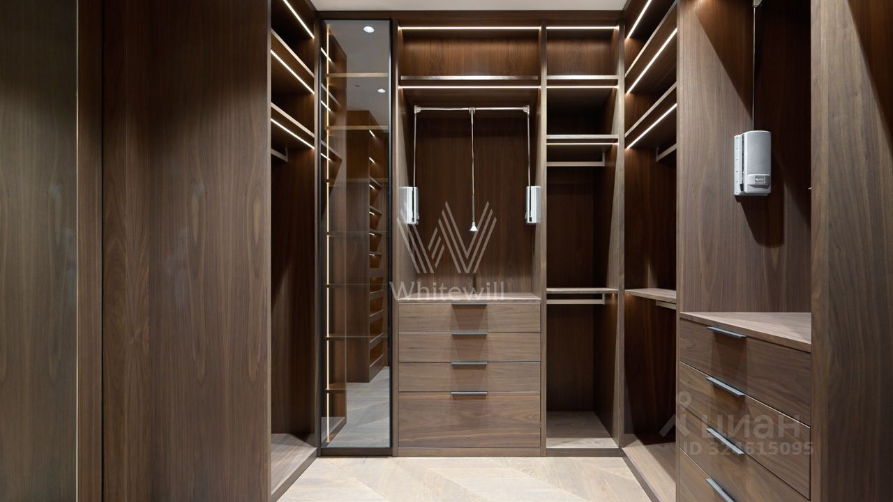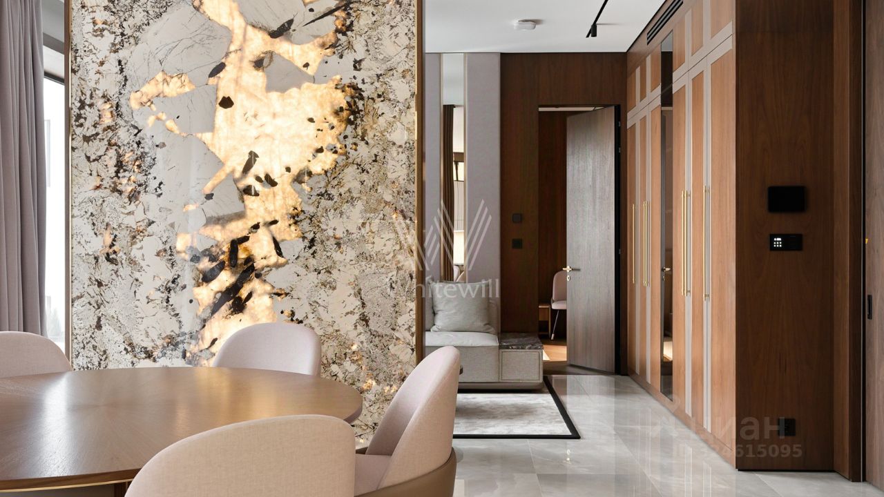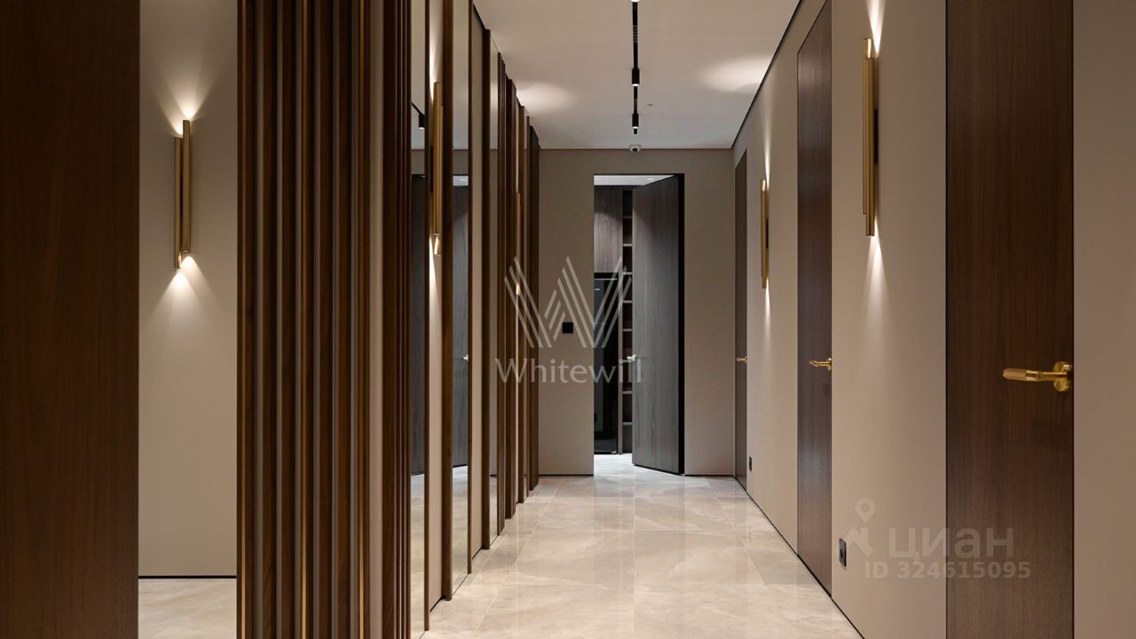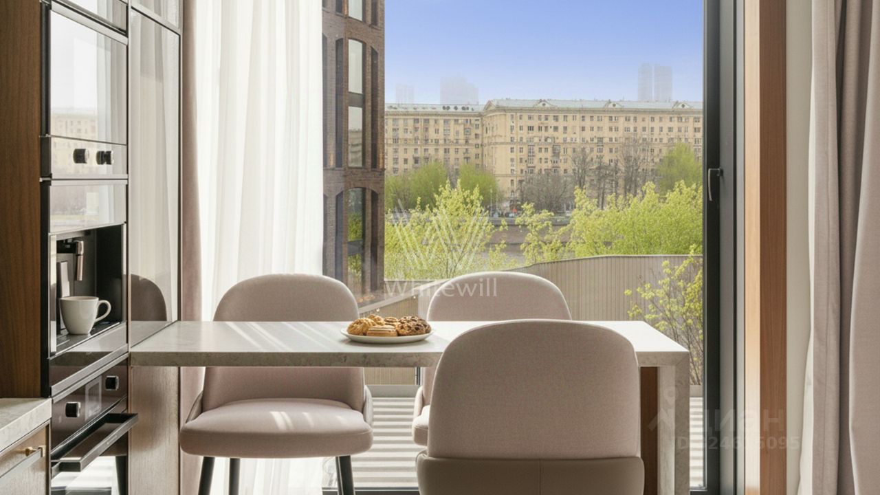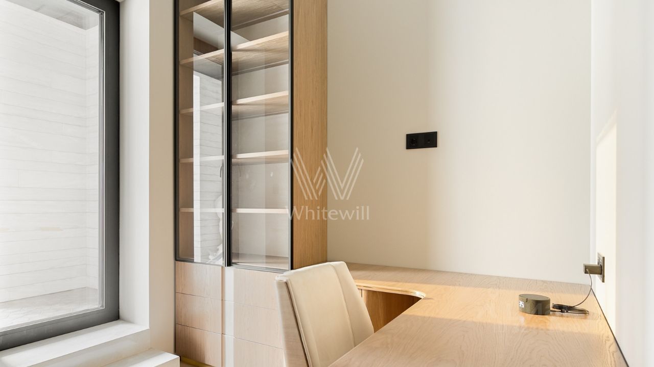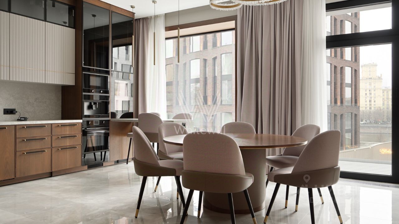 Функциональная планировка включает кухню-гостиную с обеденной зоной и биокамином, мастер-спальню с собственной ванной комнатой и гардеробной, вторую спальню со своим санузлом, гостевую спальню, кабинет, гостевой санузел, гардеробную, прачечную и холл. Панорамные окна ориентированы на две стороны света, открываются виды на Москву-реку и благоустроенную территорию комплекса.