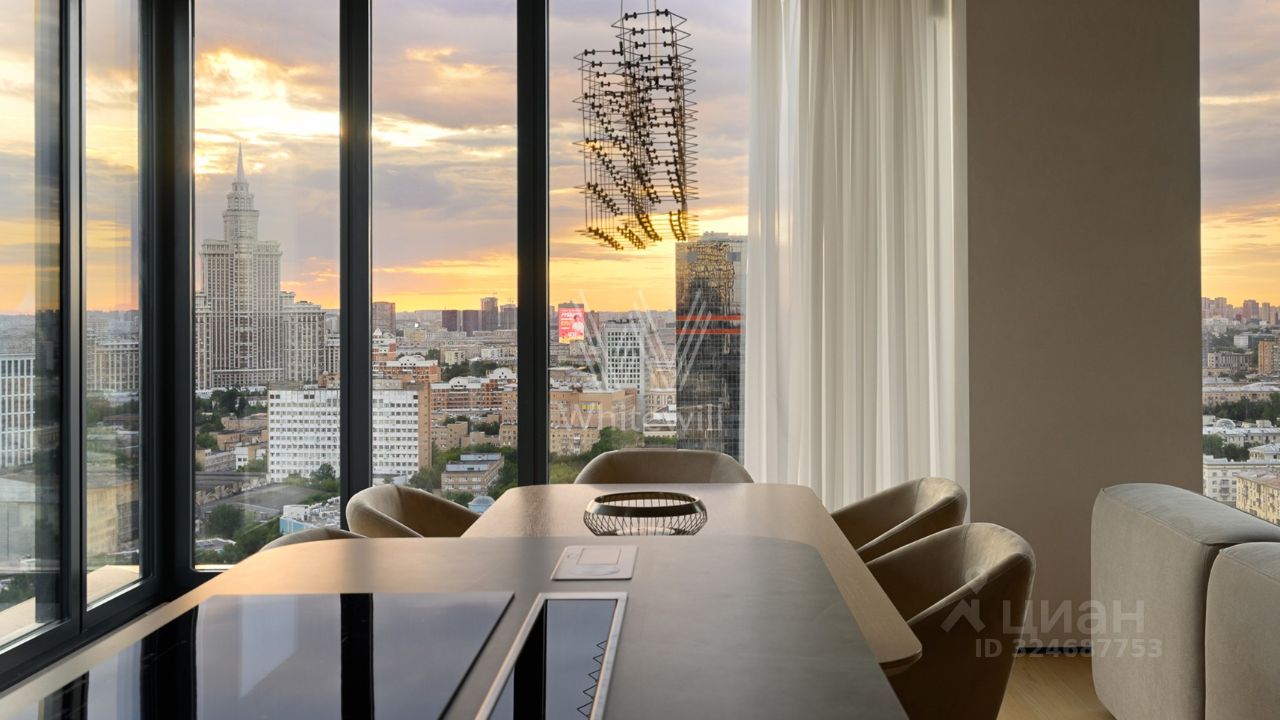 Планировка включает кухню-гостиную, мастер-спальню с собственной ванной комнатой и гардеробной, две спальни, кабинет, санузел, две гардеробные, постирочную и холл. Из панорамных окон открываются виды на ''Триумф-Палас'' и благоустроенный двор.