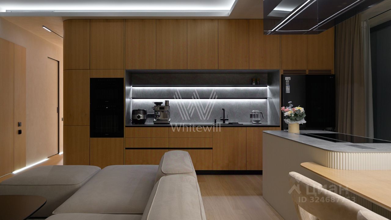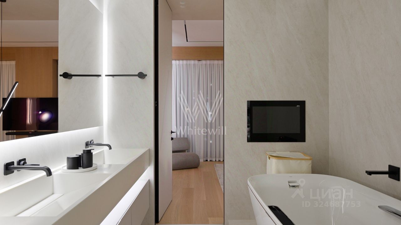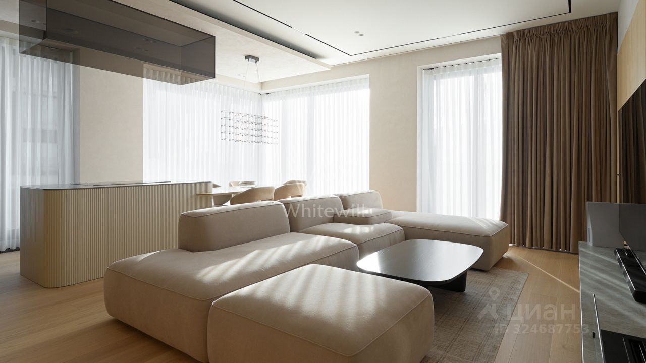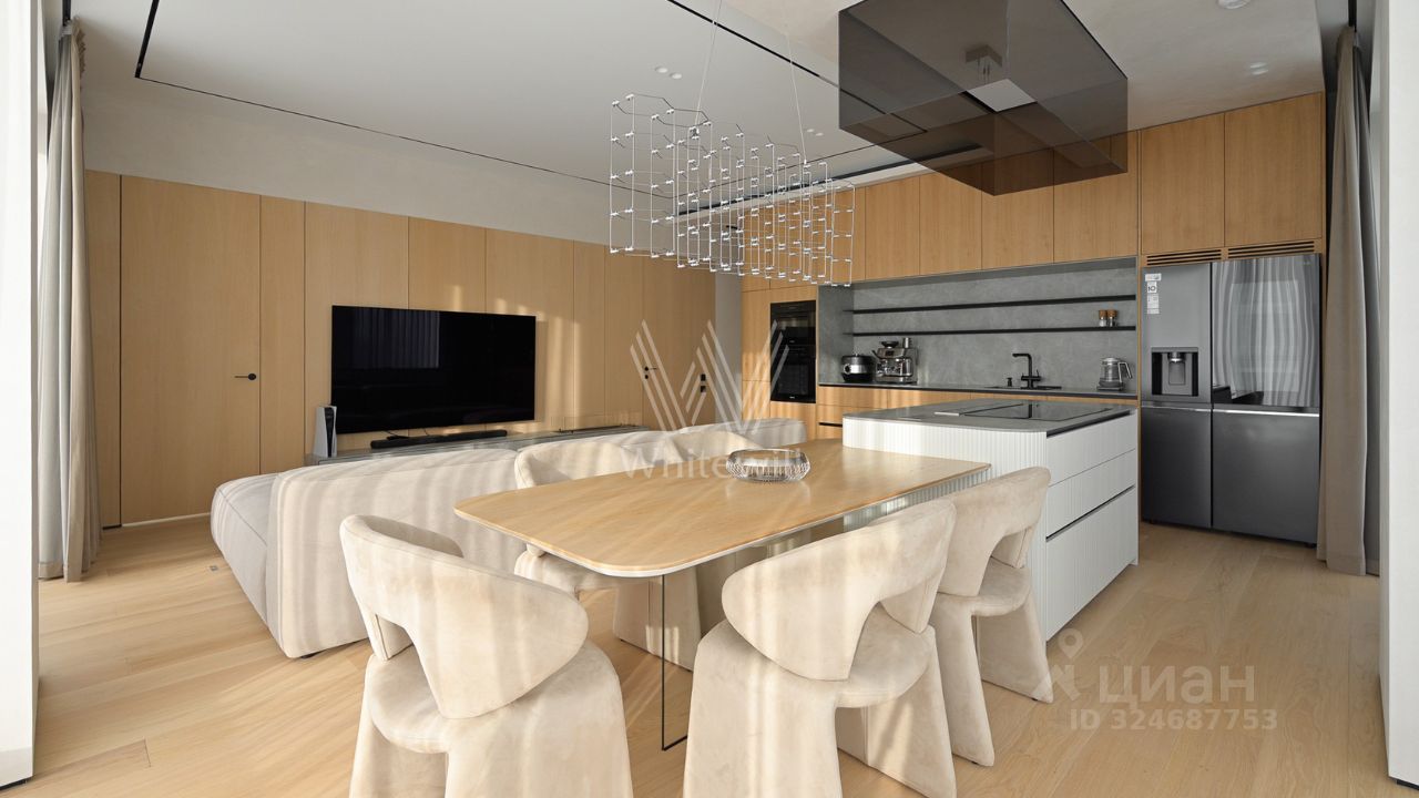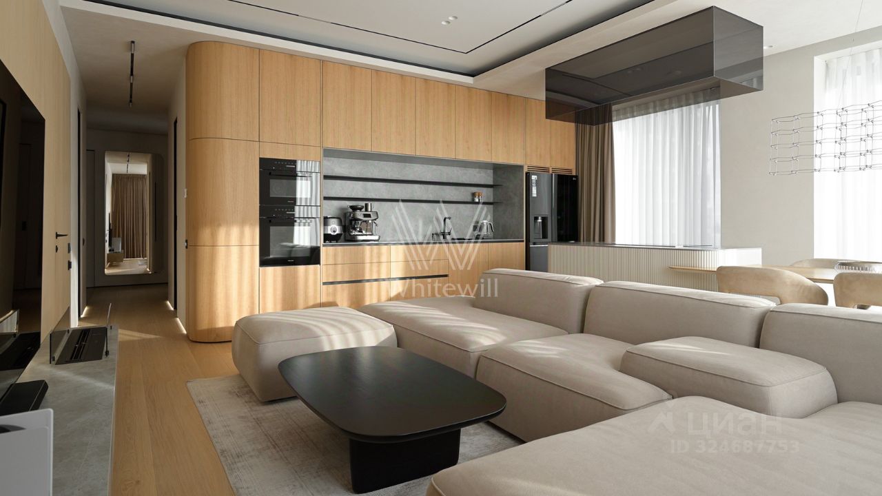 Просторная квартира с тремя спальнями в комплексе премиум-класса Prime Park. Квартира площадью 138 м² расположена на 25-м этаже в корпусе R-6. Выполнена отделка по индивидуальному проекту. На полу выложена инженерная доска Kahrs, покрытие стен и потолков под микроцемент Travertino, керамогранит от Porcelanosa, керамика — Atlas Plan. Квартира полностью укомплектована премиальной техникой Miele, Kuppersbusch, LG, мягкой мебелью Vankov, Boca Room, PlaceFreedom, Dan Form, B&B italia. Сантехника от брендов: Gessi, AXOR, Hansgrohe, Omoikiri, умные унитазы и ванны TOTO, раковины — Villeroy&Boch.