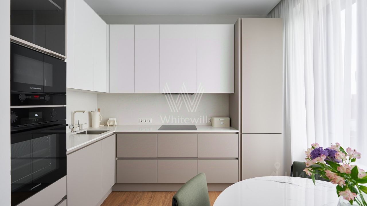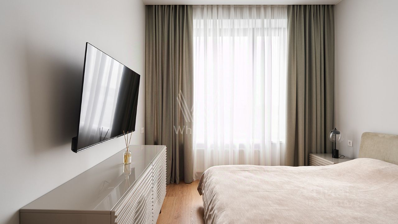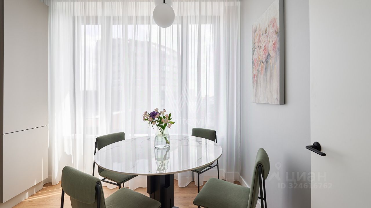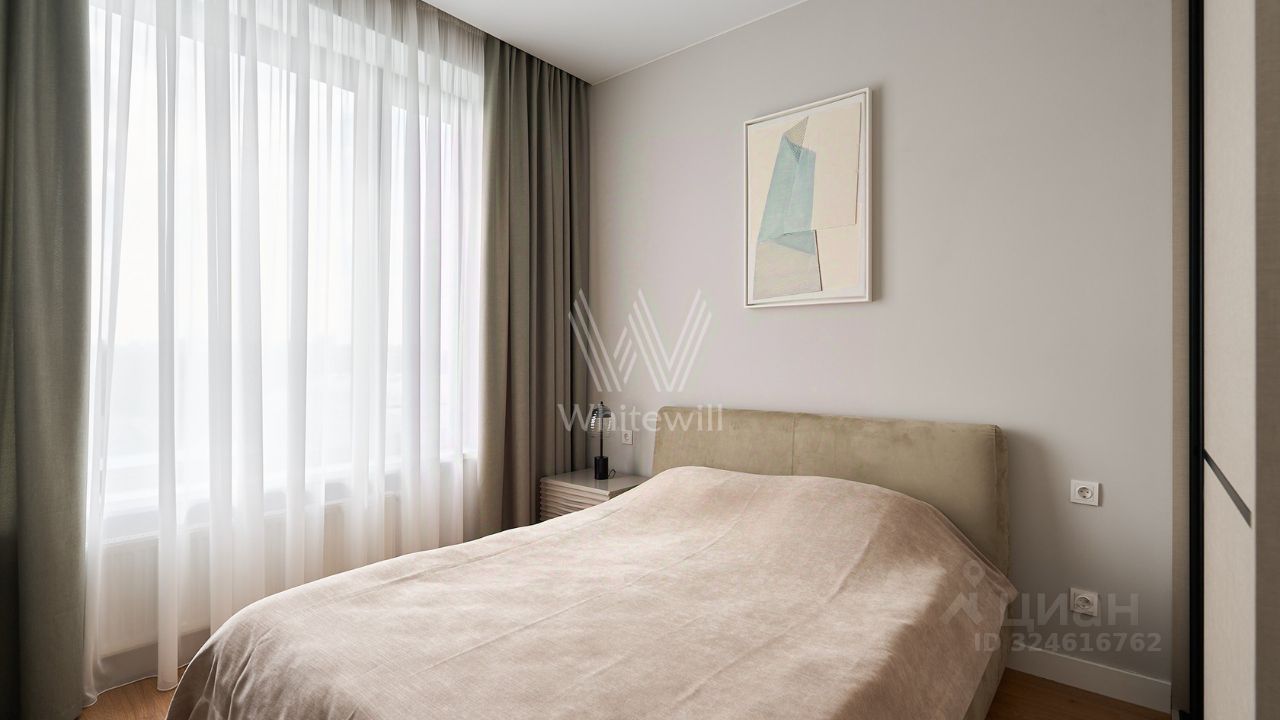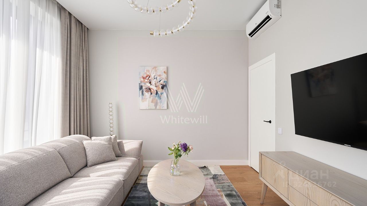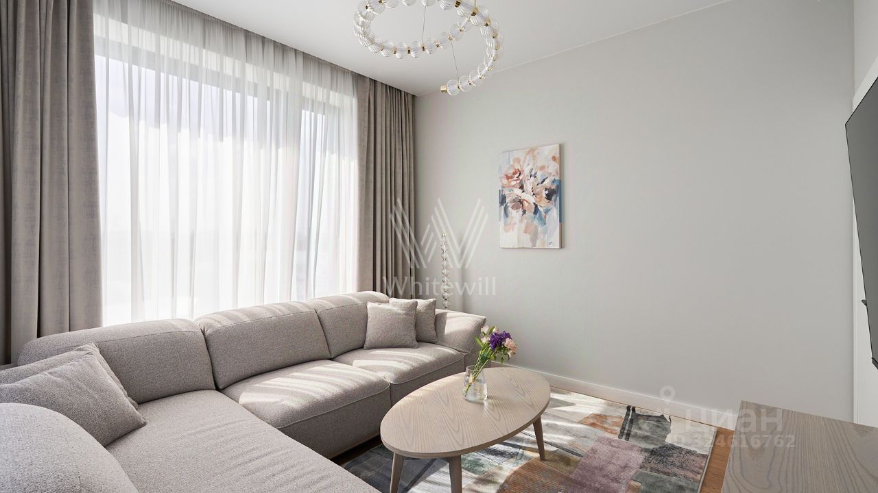 Видовые апартаменты с 1-й спальней общей площадью 50 м² в комплексе бизнес-класса ''Новоданиловская, 8''. Апартаменты расположены на 13-м этаже в корпусе 1. Выполнен новый дизайнерский ремонт в современном стиле в лаконичных светлых тонах, интерьер украшен картинами, подвесными люстрами, на полу в гостиной уложен ковер. Большие окна наполняют пространство естественным светом.