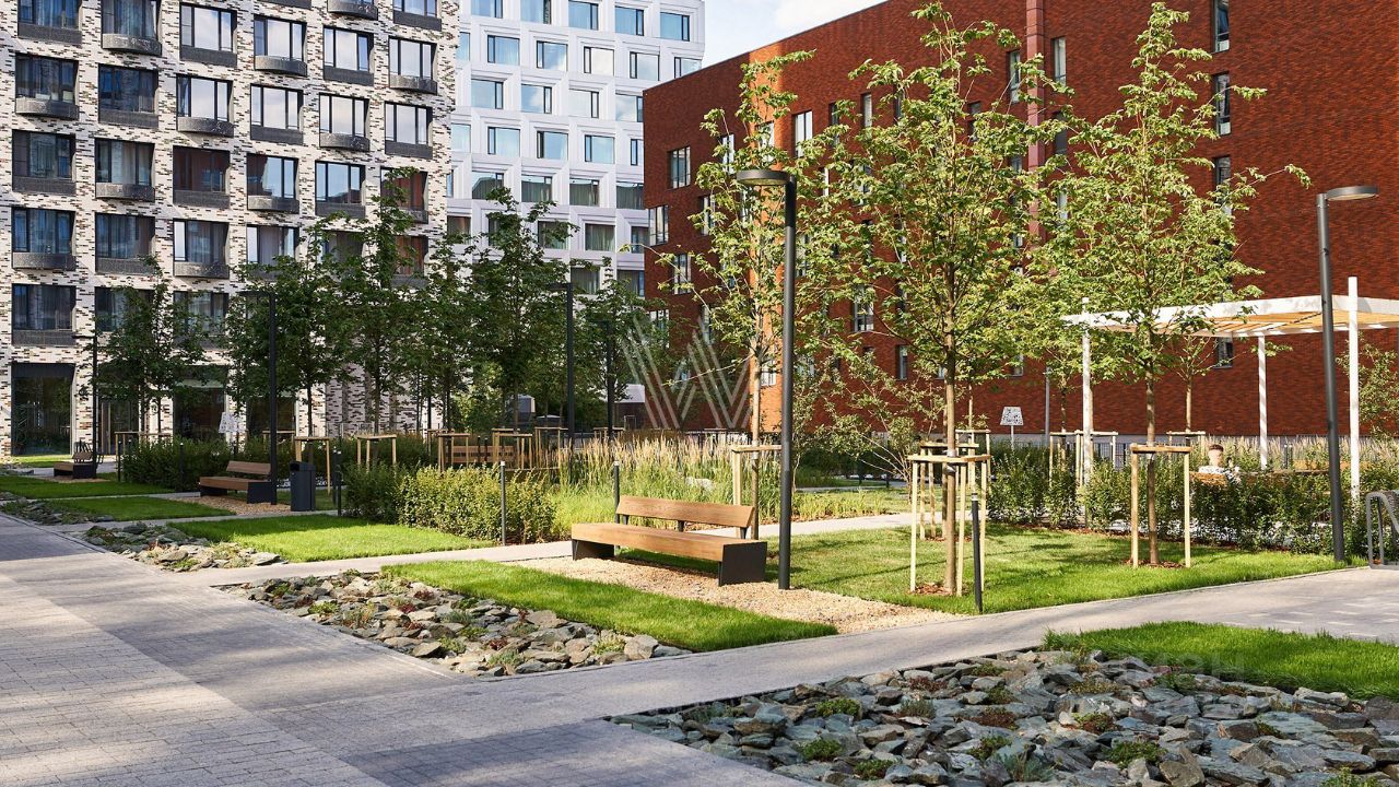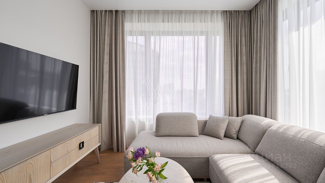 Спланирована угловая гостиная, кухня с обеденной зоной, спальня, ванная комната, прихожая с вместительным шкафом. Апартаменты полностью меблированы и укомплектованы немецкой бытовой техникой Kuppersberg. Во всех комнатах установлены кондиционеры. Апартаменты оснащены всем необходимым для комфортного проживания — напольной сушилкой, гладильной доской, утюгом, полотенцами, постельным бельем и посудой.