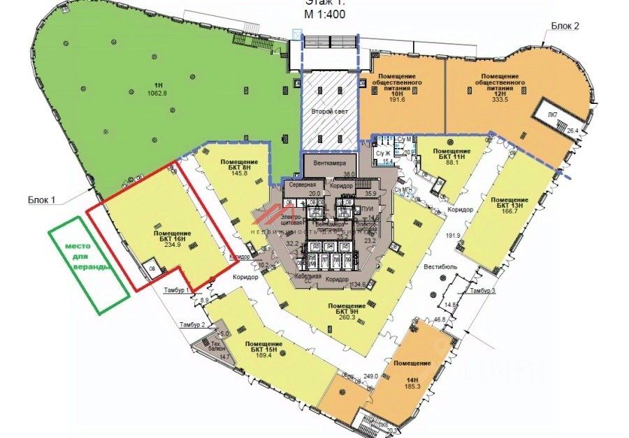 Помещение 235,8 м2, располагается на 1 этаже, открытая планировка, отдельный вход с фасада и три отдельных входа из торговой галереи, высота потолка 5,5-6 м, витринные окна по фасаду. Место для размещения рекламы. Возможна организация летней веранды. Электрическая мощность 90 кВт.