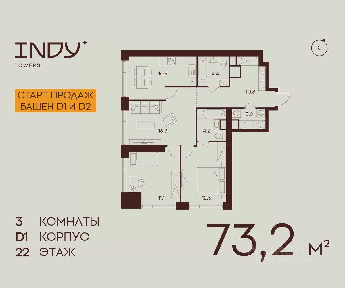 Продажа от застройщика. Продается просторная 3-комнатная квартира на 22 этаже жилого комплекса Indy Towers. Срок сдачи: 3 кв. 2029 г.