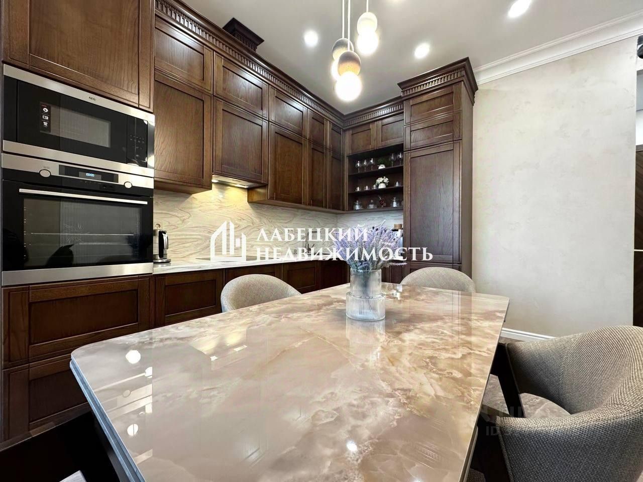 ПРОСТОРНАЯ кухня с ЭРГОНОМИЧНЫМ кухонным гарнитуром из массива дуба со ВСЕЙ необходимой техникой от НЕМЕЦКИХ производителей: Bosсh, AEG, Liebherr, а также, с качественной фурнитурой от бренда Hettich, пристенный щит и столешница - искусственный камень, Испания.