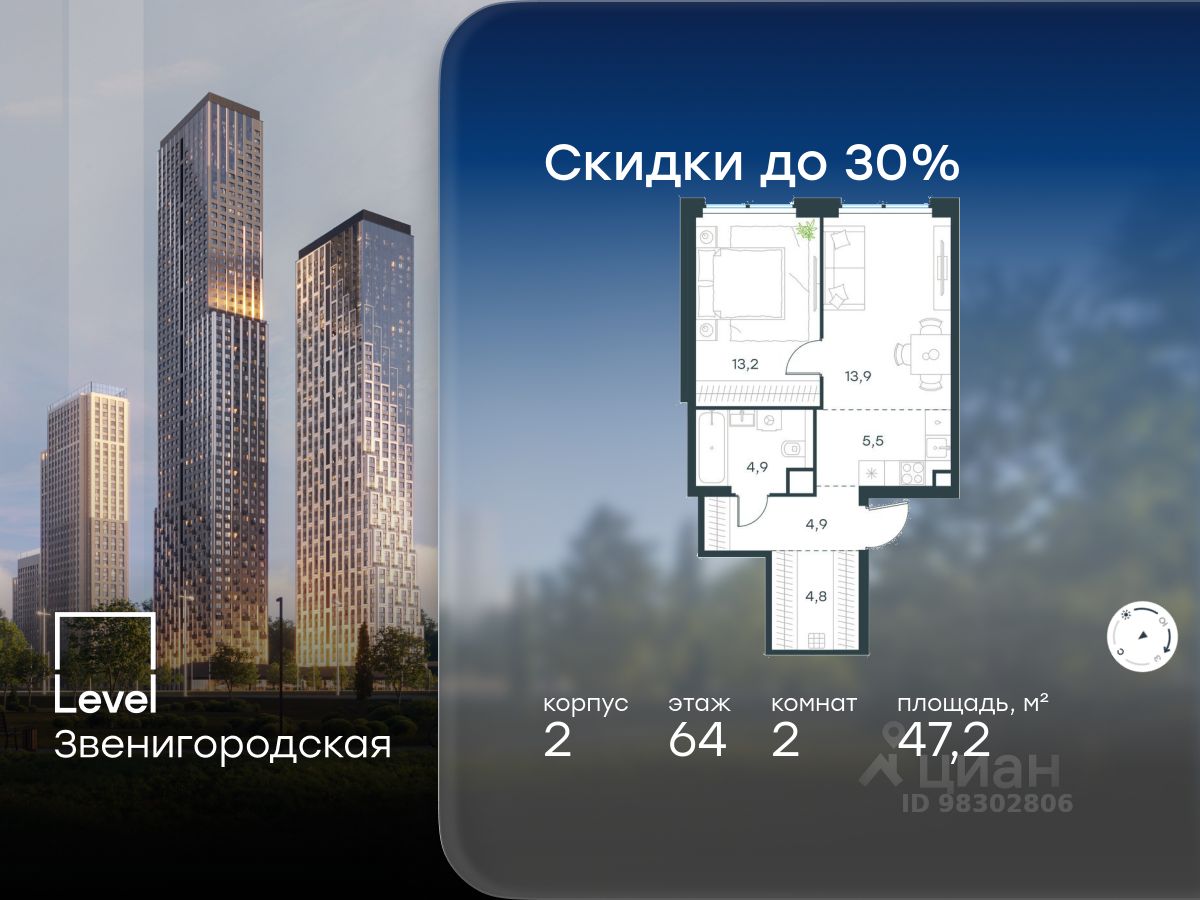 В жилом квартале продаётся 2-комнатная квартира площадью 47.20 кв.м без отделки. Квартира расположена на 64 этаже 64 этажного корпуса 2 в жилом комплексе комфорт класса Level Звенигородская (компания Level Group/Левел групп).