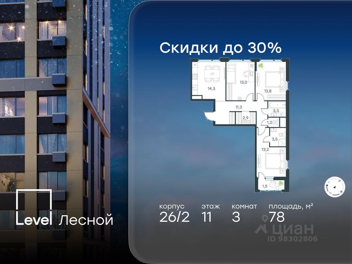 В районе, утопающем в густой зелени лесов, многочисленных парков и скверов, продаётся 3-комнатная квартира площадью 78.00 кв.м без отделки. Квартира расположена на 11 этаже в жилом комплексе комфорт-класса Level Лесной (компания Level Group/Левел групп).