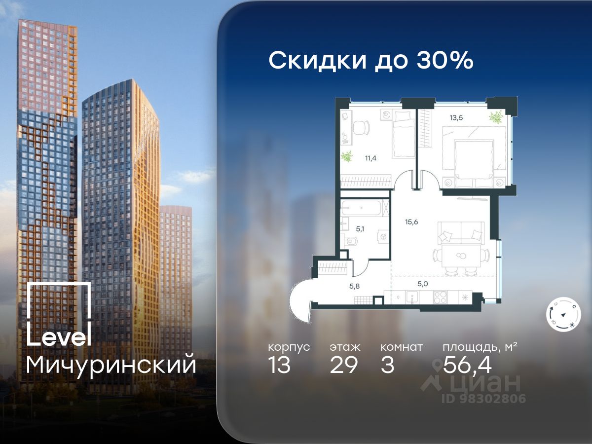 продам 3-к, Левел Мичуринский ЖК, 1332 965 319 ₽