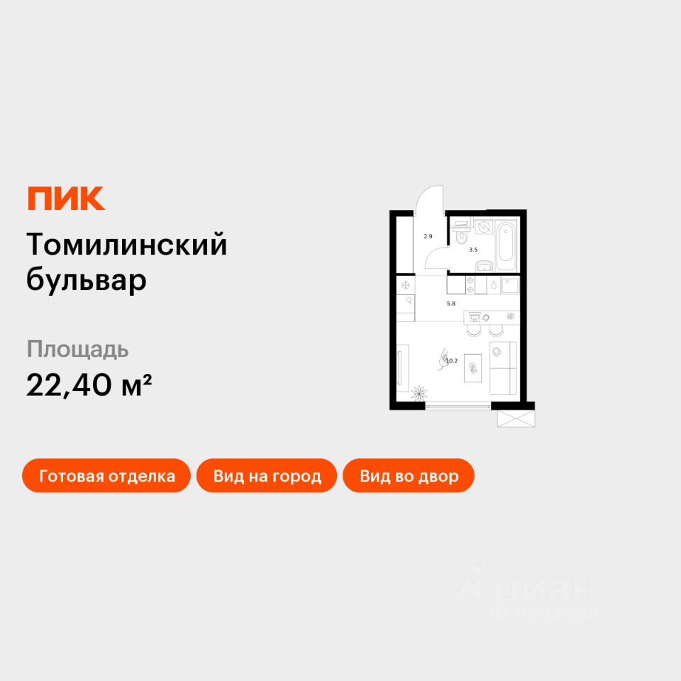 Продаётся квартира-студия площадью 22,4 кв.м на 17 этаже 25 этажного дома (Корпус 5-8, Секция 2) проекта ПИК Томилинский бульвар. Светлый просторный подъезд на уровне земли, функциональная планировка, большие окна, c отделкой.