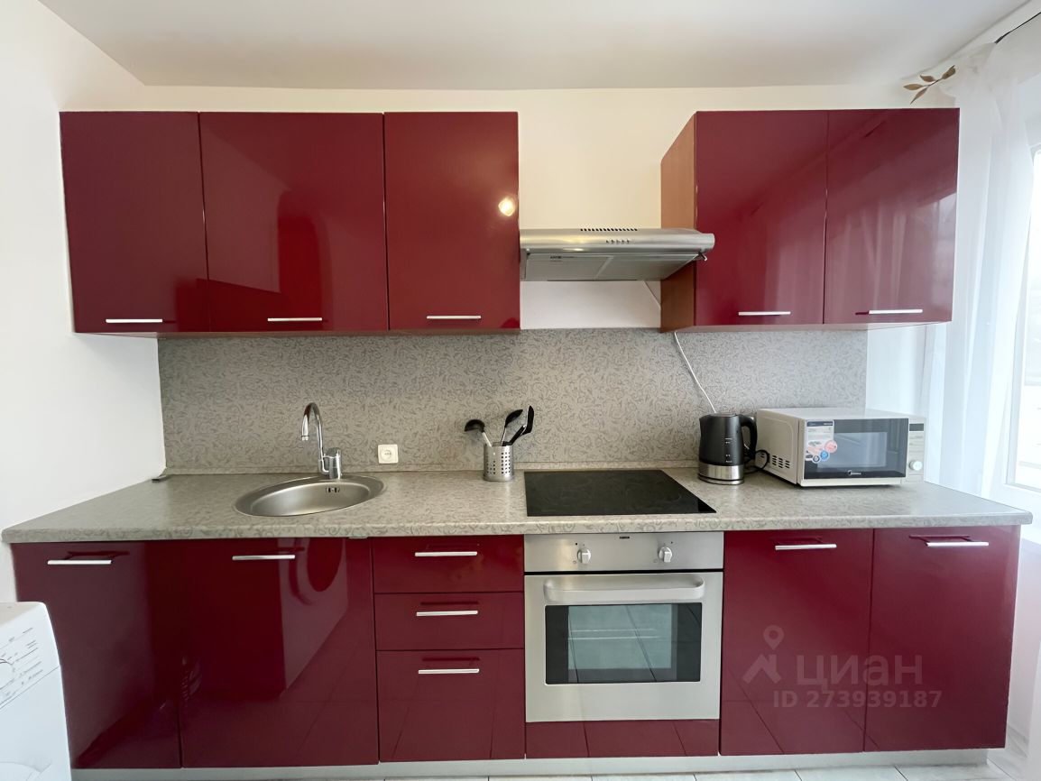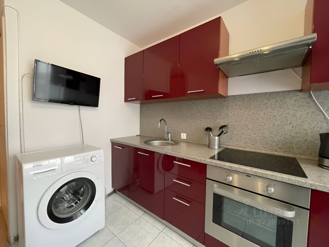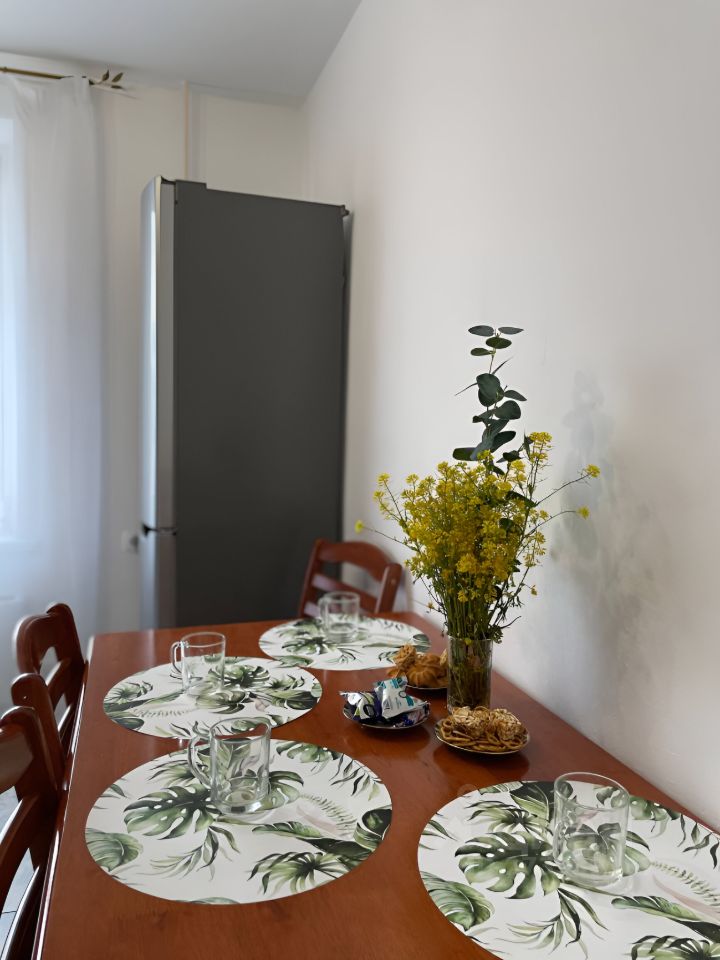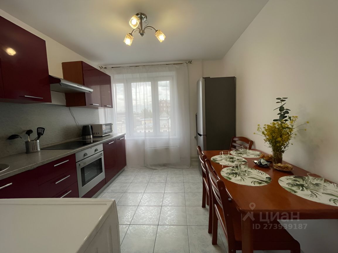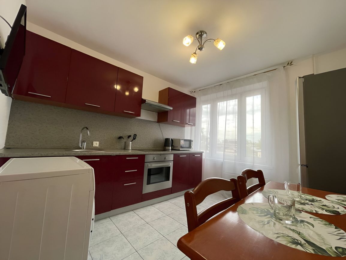 Просторная кухня 10 кв.м: кухонный гарнитур со встроенной техникой (духовка+плита), стиральная машина Bosch, холодильник LG, вместительный стол для большой семьи, хороший вид из окна.