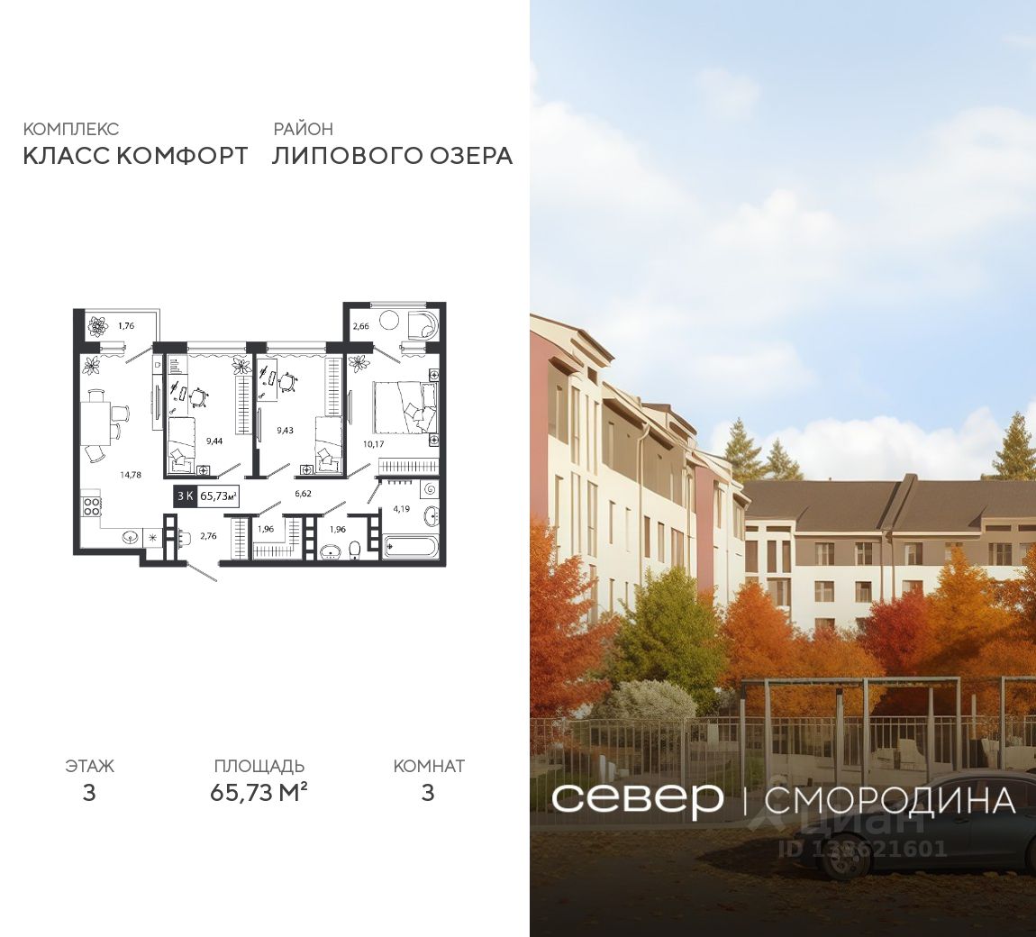 Продаётся квартира площадью 65.73 м2 в жилом комплексе ''Смородина''. Квартира находится на 3 этаже, жилая площадь квартиры 29.04 м2, площадь просторной кухни — 14.78 м2. Среди особенностей планировки — изолированные комнаты с окнами на одну сторону, 1 совмещённый санузел.