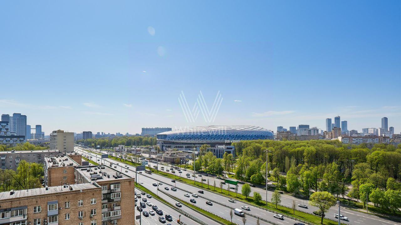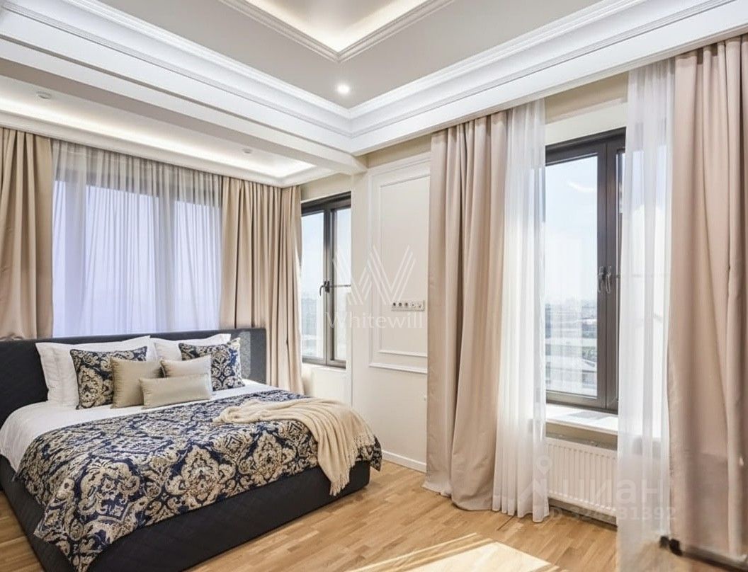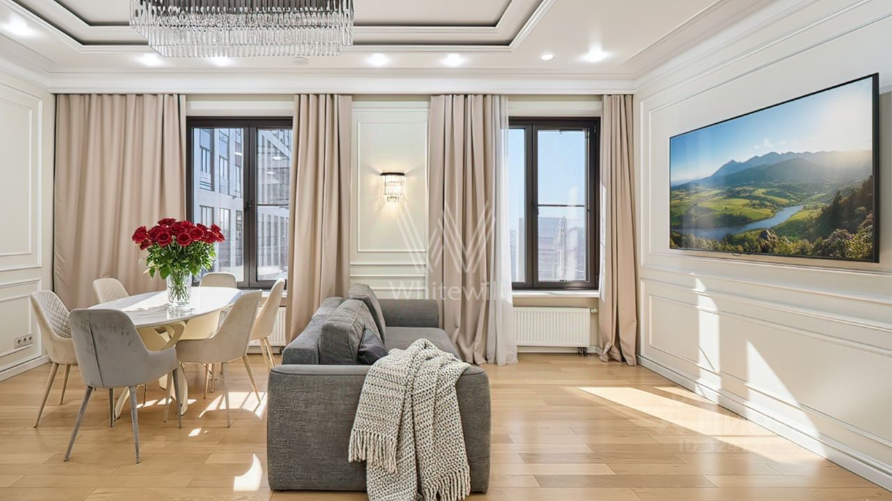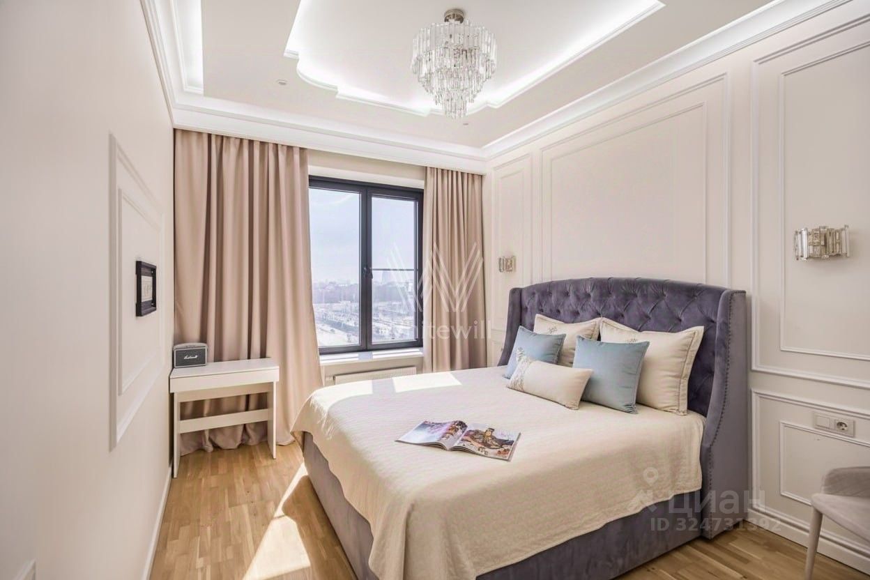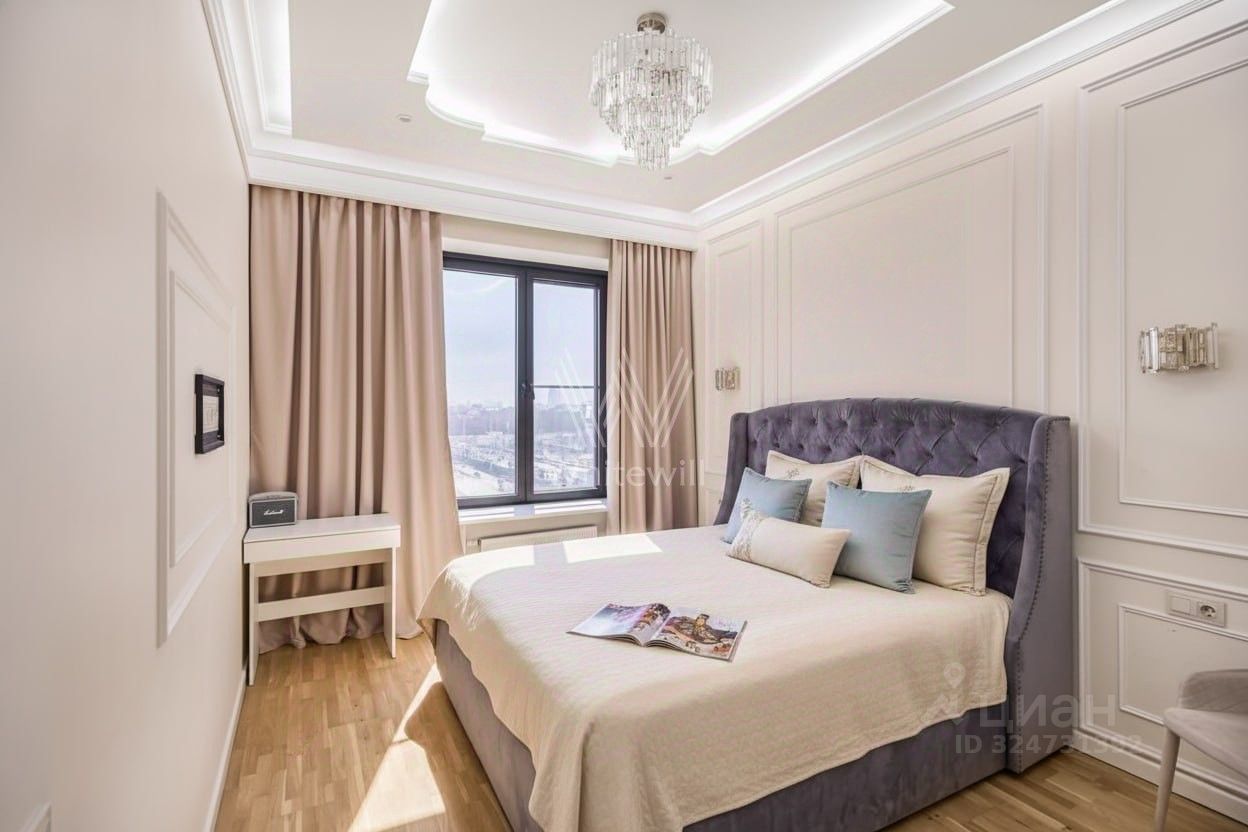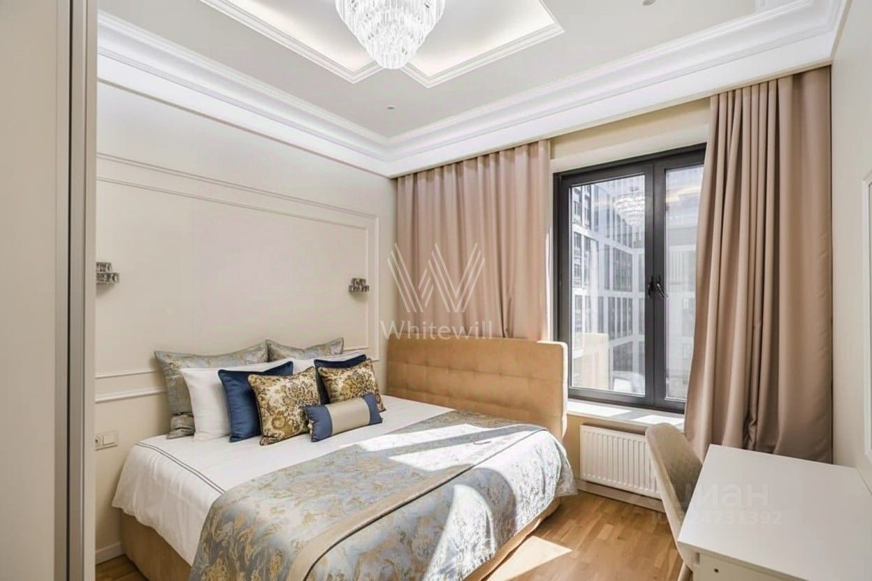 Квартира полностью меблирована и укомплектована бытовой техникой. Функциональная планировка включает кухню-гостиную с обеденной зоной, 4 спальни, гардеробную и холл. Окна, ориентированные на две стороны света, открывают виды на благоустроенную территорию комплекса, город и ''ВТБ Арену''.