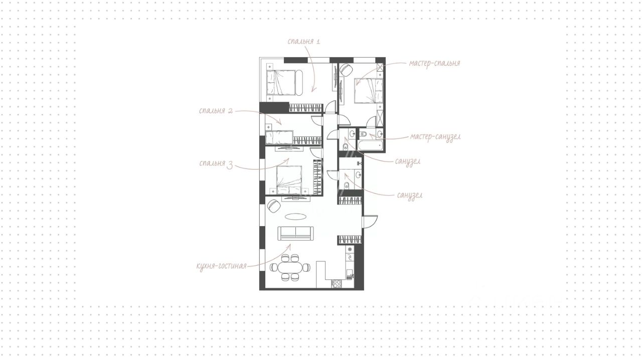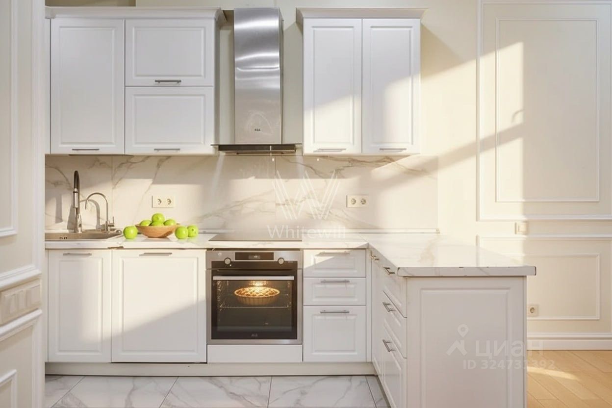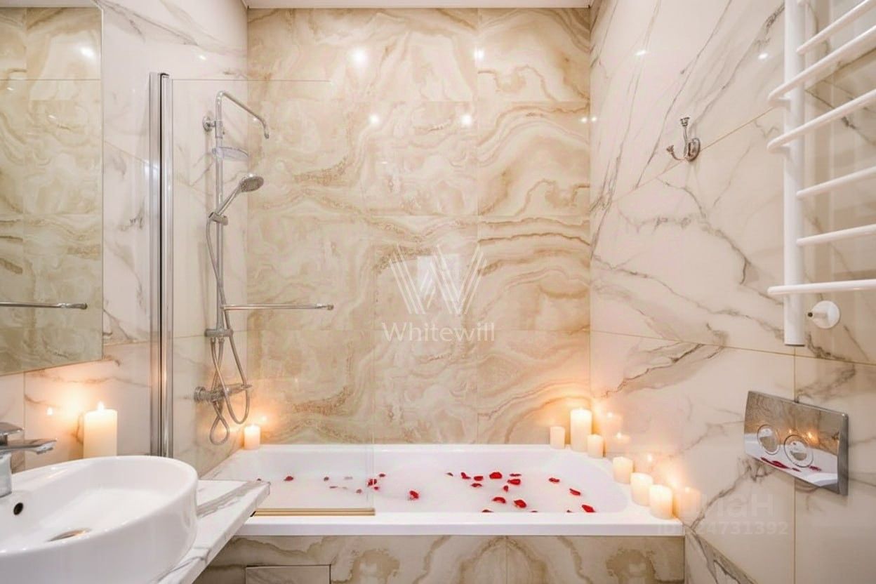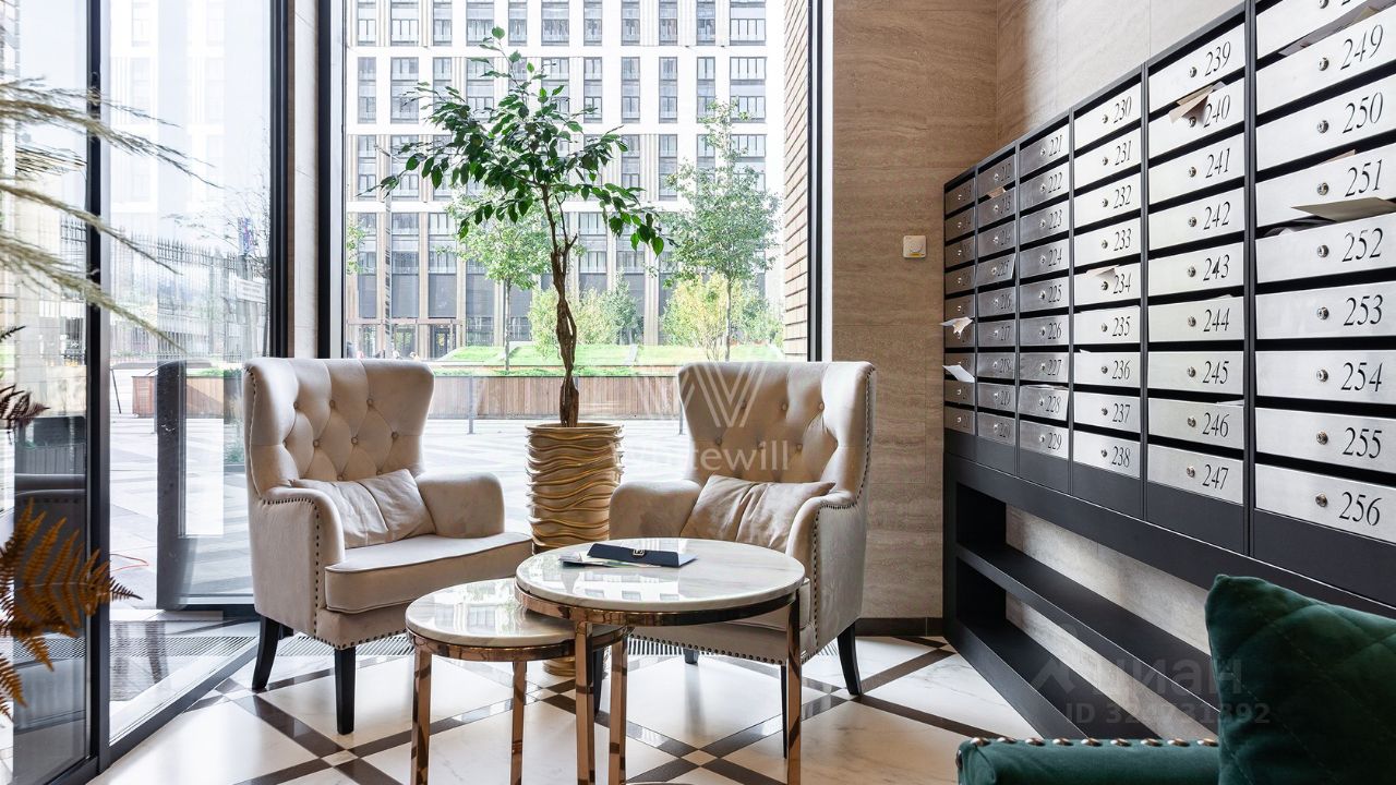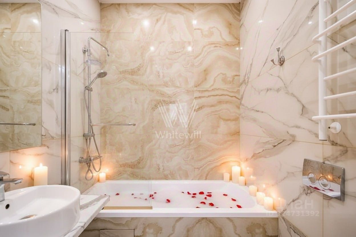 Квартира полностью меблирована и укомплектована бытовой техникой. Функциональная планировка включает кухню-гостиную с обеденной зоной, 4 спальни, гардеробную и холл. Окна, ориентированные на две стороны света, открывают виды на благоустроенную территорию комплекса, город и ''ВТБ Арену''.