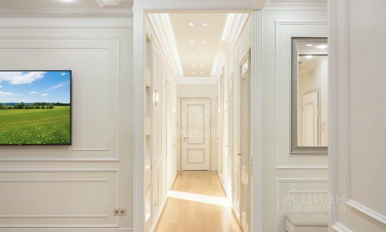 Угловая квартира с 4 спальнями общей площадью 108 м² в комплексе бизнес-класса ''Царская площадь''. Квартира с авторской отделкой расположена на 11 этаже в корпусе ''Романовский''. Интерьер в классическом стиле украшают декоративные молдинги, многоуровневые потолки и дизайнерские люстры. Продуманы различные сценарии освещения.