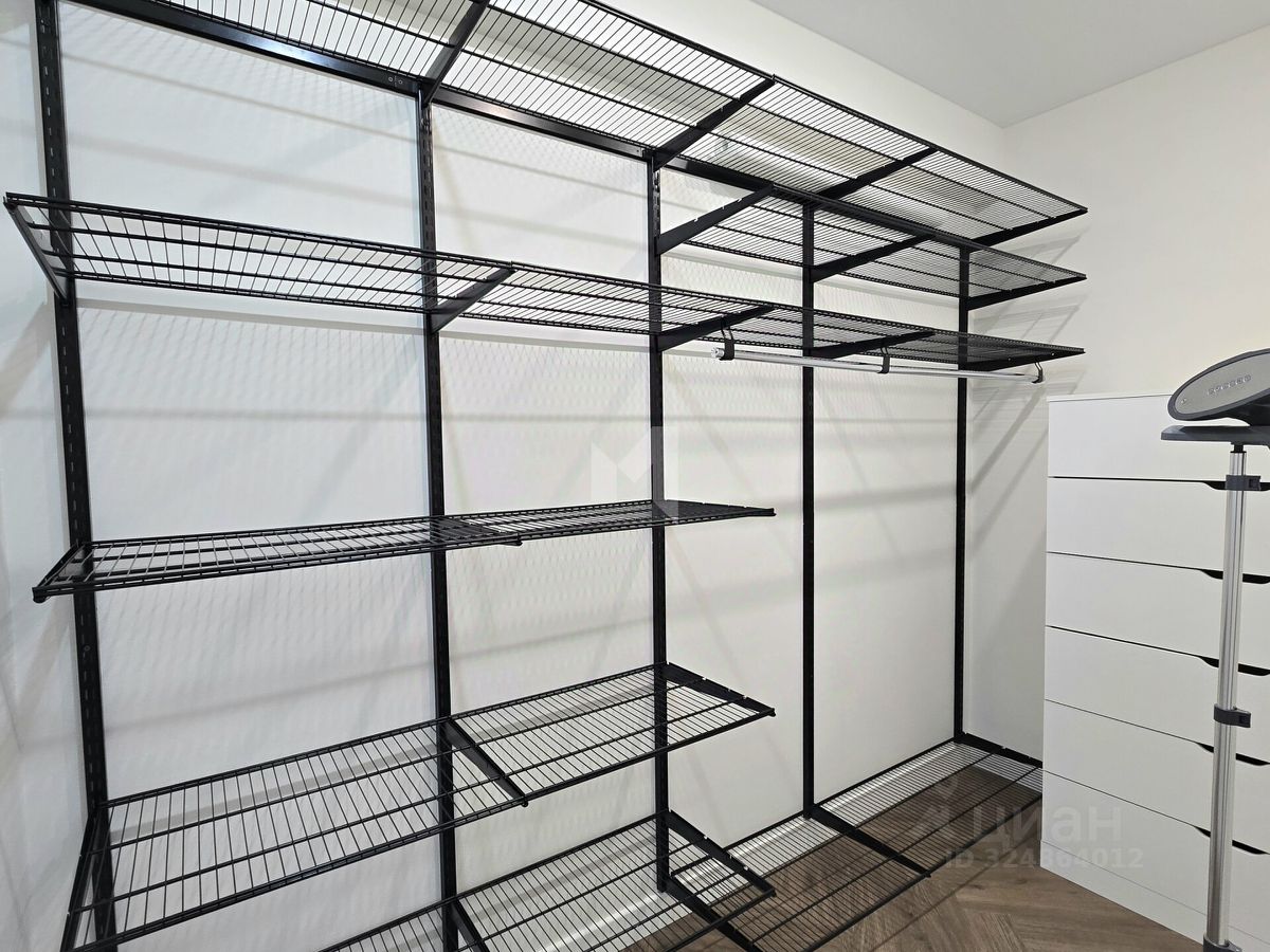Изолированная спальня с большой гардеробной, гостиная, кухня и просторный санузел с душем.