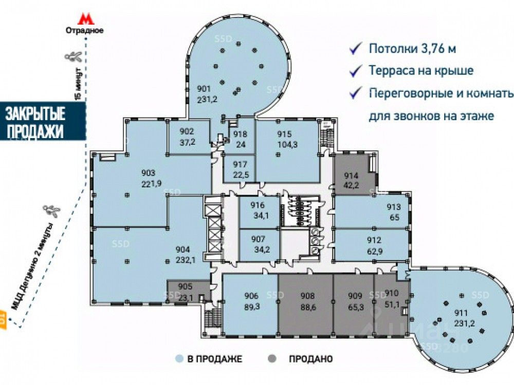 Продажа помещения свободного назначения в новом МФК ''Гало''. Адрес: Алтуфьевское шоссе, 35к1. Близость жилых массивов и промышленных зон обеспечивает высокий спрос на офисы, производства и склады. Согласно планам, в ближайшие 5 лет здесь будет построено суммарно 2,8 млн м² жилой недвижимости, 400 тыс. м² коммерческой недвижимости. МФК ''Гало'' представляет собой 10-ти этажный корпус с благоустроенной территорией. Вокруг комплекса создана комфортная озеленённая среда с новыми удобными разъездами и парковочными местами. -1 этаж: Подземный паркинг, включающий места для мототранспорта, зоны хранения, электрозарядные станции, и лифт в подвальный уровень. 2-10 этажи: Комбинация производственных, складских и офисных пространств, обепеченная максимально комфортной инфраструктурой. На крыше созданы дополнительные пространства для отдыха и работы. Транспортная доступность: 15 минут до ТТК, 12 мин до МКАД, 4 мин до СВХ. До станции D1 Дегунино 1 минута пешком. До м. Отрадное 18 минут.