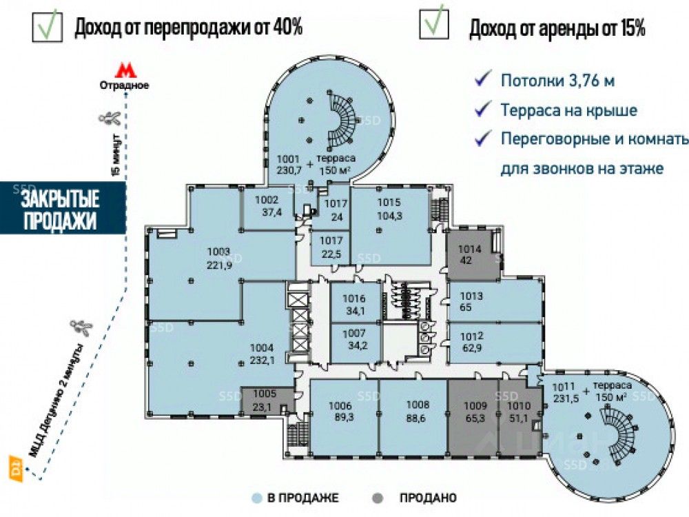 Продажа помещения свободного назначения в новом МФК ''Гало''. Адрес: Алтуфьевское шоссе, 35к1. Близость жилых массивов и промышленных зон обеспечивает высокий спрос на офисы, производства и склады. Согласно планам, в ближайшие 5 лет здесь будет построено суммарно 2,8 млн м² жилой недвижимости, 400 тыс. м² коммерческой недвижимости. МФК ''Гало'' представляет собой 10-ти этажный корпус с благоустроенной территорией. Вокруг комплекса создана комфортная озеленённая среда с новыми удобными разъездами и парковочными местами. -1 этаж: Подземный паркинг, включающий места для мототранспорта, зоны хранения, электрозарядные станции, и лифт в подвальный уровень. 2-10 этажи: Комбинация производственных, складских и офисных пространств, обеспеченная максимально комфортной инфраструктурой. На крыше созданы дополнительные пространства для отдыха и работы. Транспортная доступность: 15 минут до ТТК, 12 мин до МКАД, 4 мин до СВХ. До станции D1 Дегунино 1 минута пешком. До м. Отрадное 18 минут.