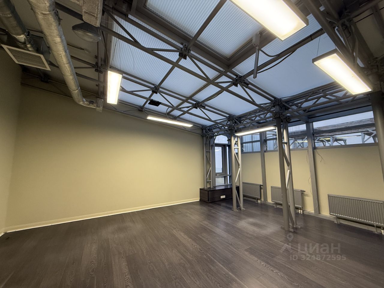 Шикарные панорамные окна во всю стену. Офис правильной, прямоугольной формы.