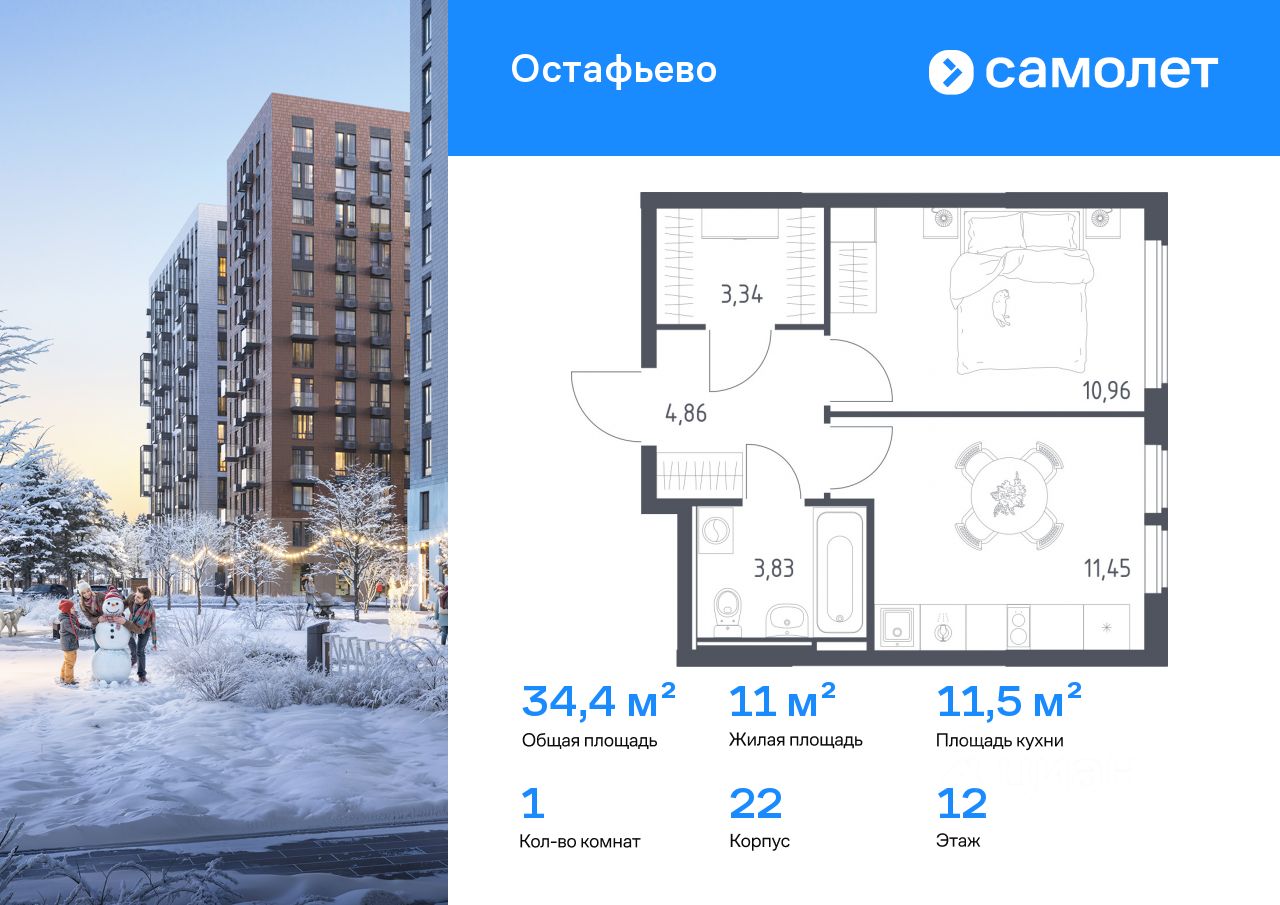 Строим кварталы для жизни с заботой о будущем. Предлагается 1-комнатная квартира комфорт-класса 34,44 кв.м в корпусе 22 на 12 этаже, в ЖК ''Остафьево'' Квартира с предчистовой отделкой. Доступность дополнительных опций уточняйте у застройщика.