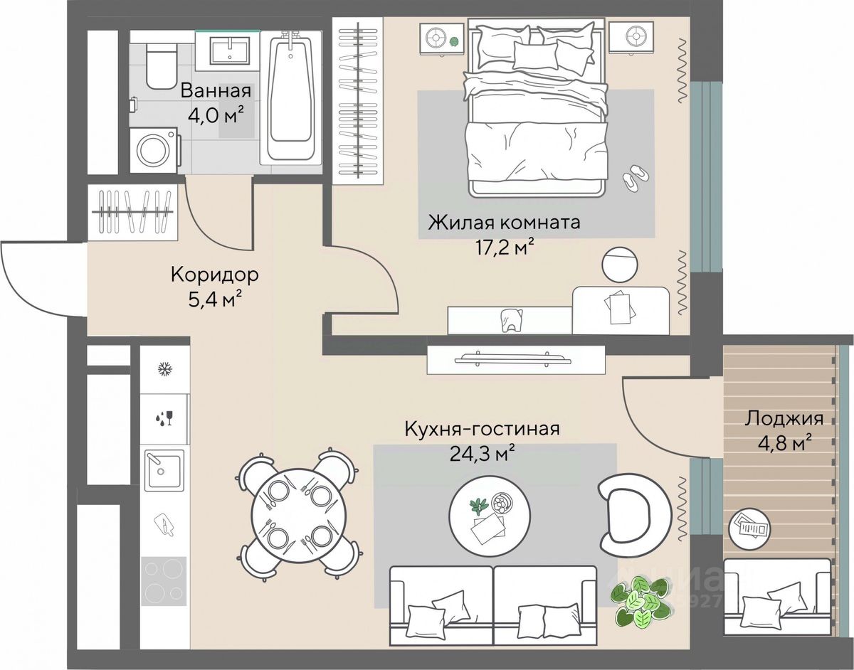 Продаётся 1-комнатная квартира в строящемся доме (Секции 1.4-1.6 (2 очередь)), срок сдачи: IV-кв. 2026, общей площадью 53.3 кв.м., на 4 этаже.