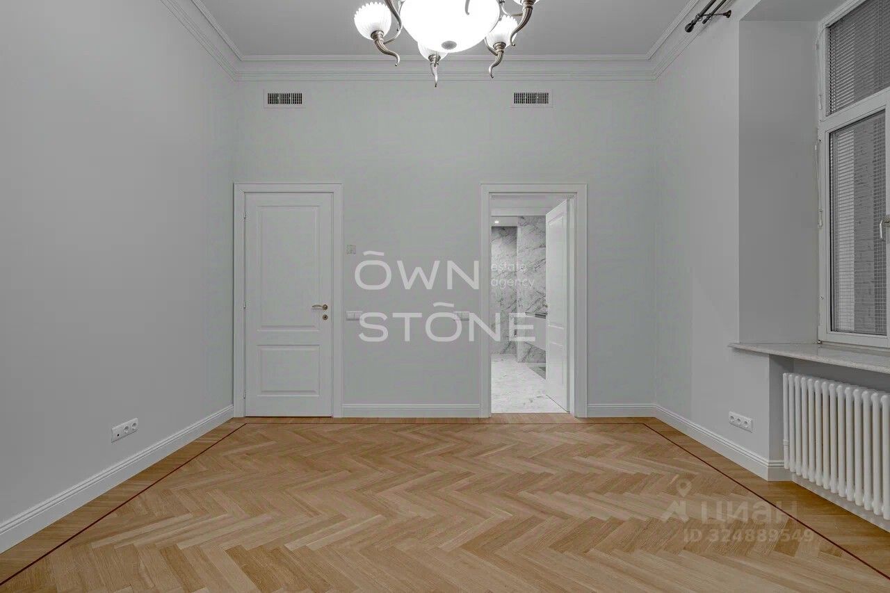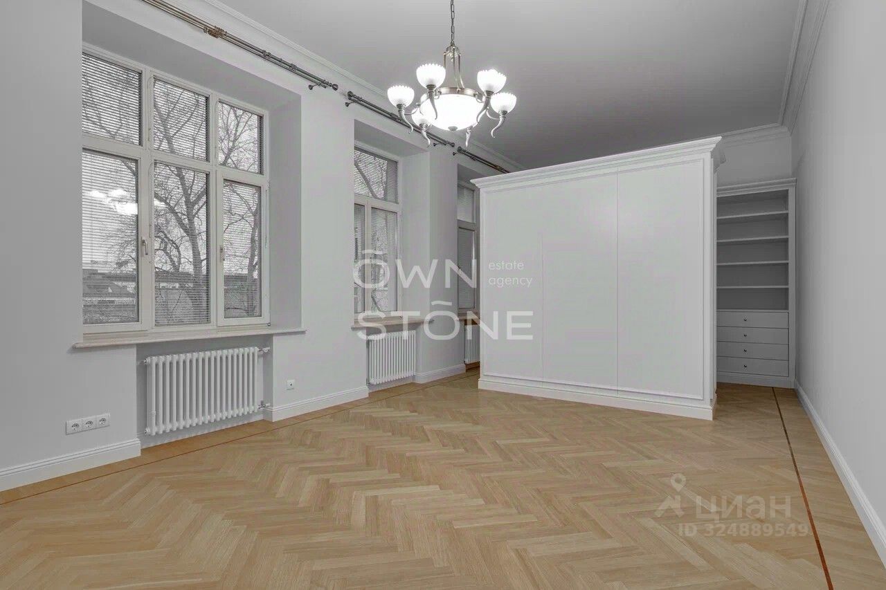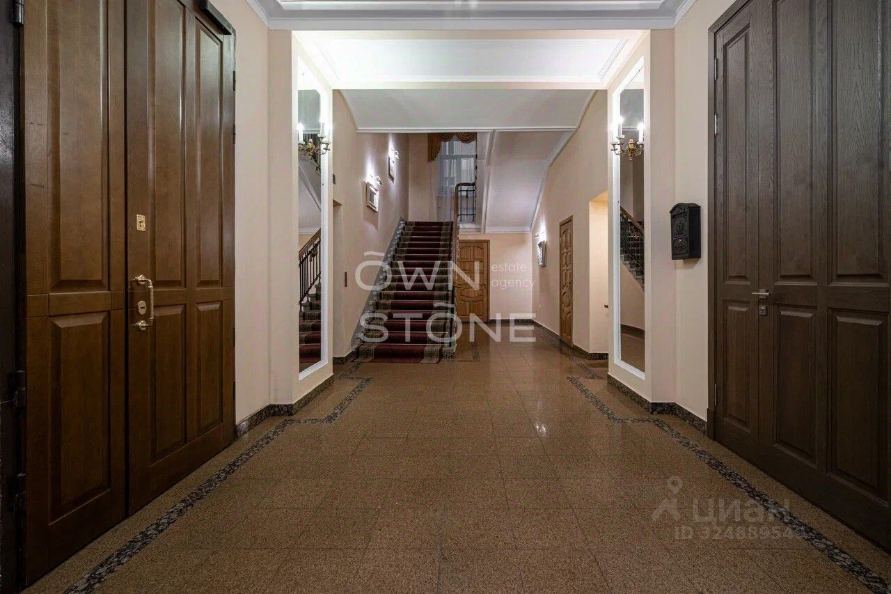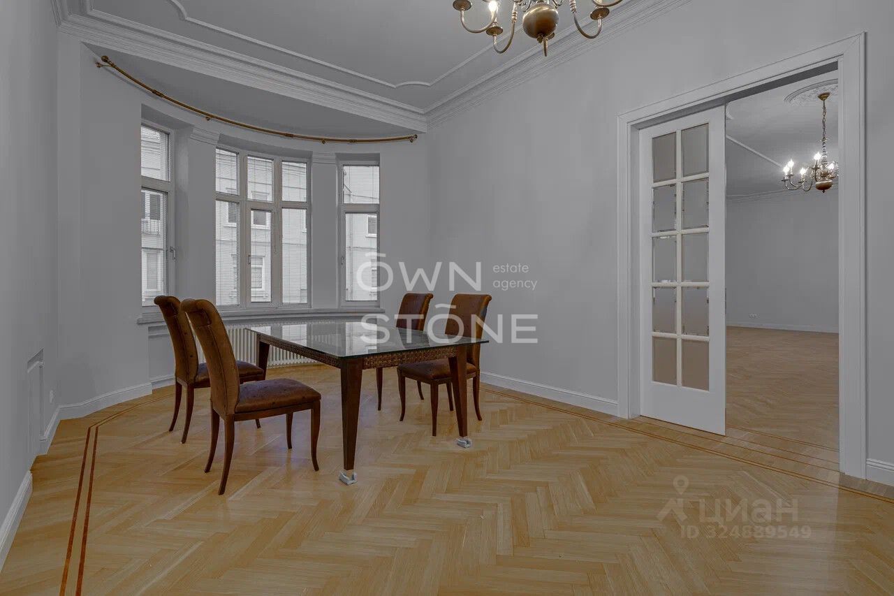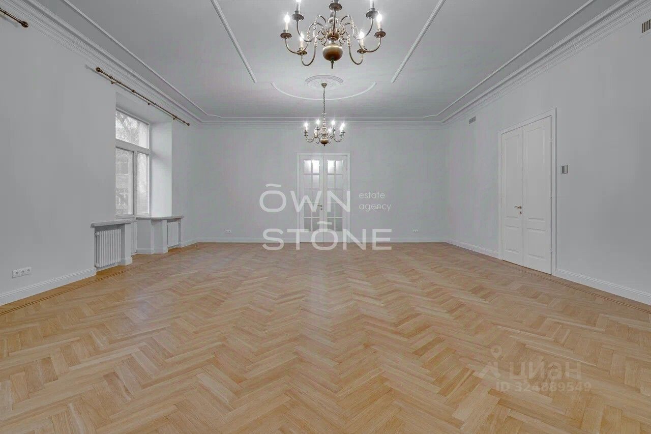 Стильная 6-комнатная квартира. 5/6 этаж. Высота потоков - 4.2 м. Количество спален: 5. Количество санузлов: 3 совмещенных, 1 раздельный. Общая площадь: 335 кв. м. Площадь кухни: 23 кв. м. Площадь комнат: 35-32-25-30-70-24. Окна во двор