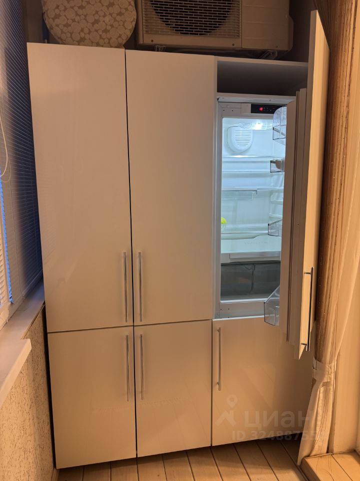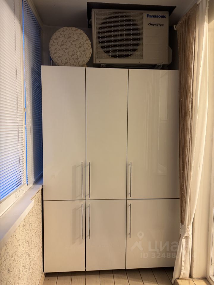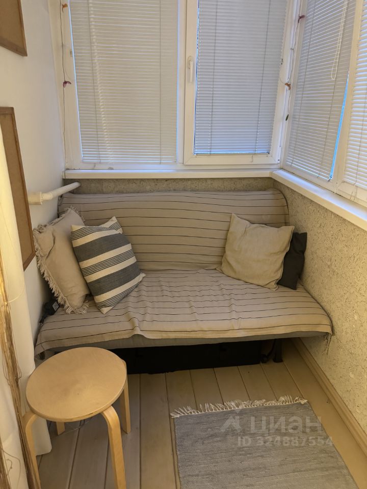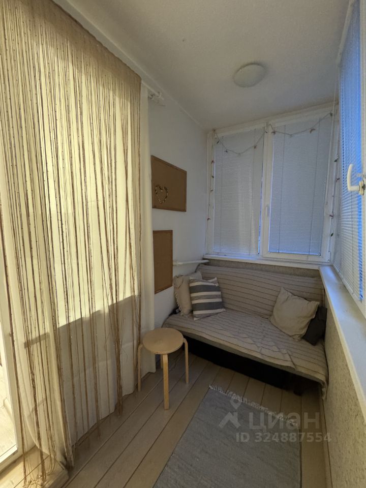 Большая, глубокая лоджия утеплена, оснащена диваном, который раскладывается в полноценное спальное место, шкафами для хранения и встроенным холодильником.